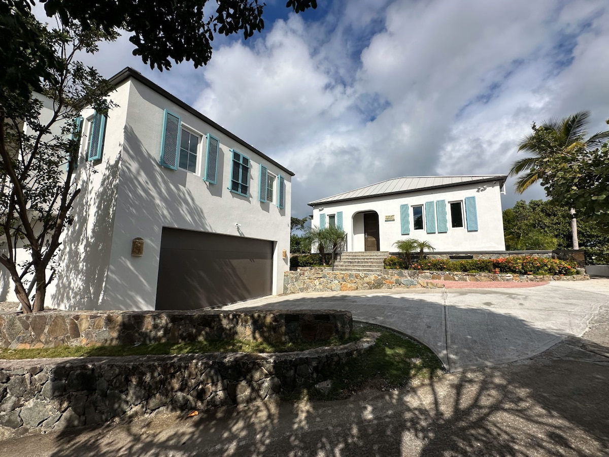 Disfruta de impresionantes vistas al mar de las islas cercanas desde esta hermosa villa de piedra, situada en una empinada ladera cerca de la carretera principal. La unidad del piso superior ofrece un refugio tranquilo a solo 8 minutos de Cruz Bay, con fácil acceso a playas, restaurantes y tiendas de comestibles perfectas para familias o grupos pequeños. • Suite principal con cama tamaño king y patio • 2 dormitorios con camas tamaño queen. • 1 dormitorio con 2 camas completas. • 2 baños • Sala de estar • Cocina con estación de trabajo • Comedor • Aire acondicionado • Televisores inteligentes • Wi-Fi