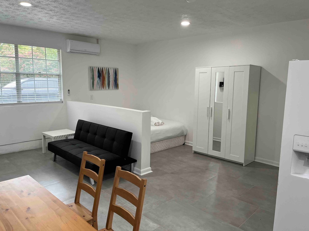 Un estudio privado diseñado a partir de una conversión de garaje, ubicado en el prometedor distrito de West King. La entrada independiente con cerradura sin llave te da la bienvenida a este espacio cómodo y limpio con una cama tamaño queen, tu propio baño, cocina pequeña y 2 plazas de aparcamiento disponibles en la entrada. El aire acondicionado mini-split enfría y calienta el estudio cómodamente. Internet de alta velocidad, TV de pantalla plana con Netflix para relajarse después de un día de visitas turísticas. Bicicletas para explorar nuestro centro histórico a menos de 2 millas de distancia.