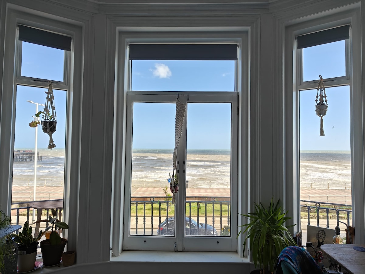 Hermoso, espacioso apartamento orientado al sur con impresionantes vistas al mar, características originales y techos altos. ¡Los amaneceres/puestas y los reflejos de la luna son impresionantes! Entre St Leonards on Sea y Hastings, ¡y a 30 segundos de la playa! El dormitorio tiene una cama tamaño king y la sala de estar un sofá cama doble. La ropa de cama es de algodón/ropa de cama lavada con productos no tóxicos. ¡El apartamento está en el tercer piso, pero no hay tantas escaleras y, como tal, con vistas al mar lejos de la multitud enloquecida! Hay estacionamiento gratuito cerca