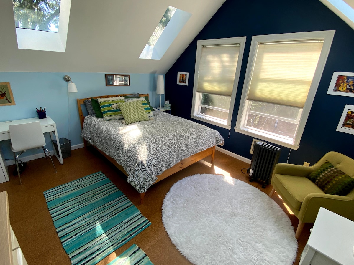 Este apartamento único está sobre un garaje/tienda, separado de la casa principal. Escondido en un bosque urbano. Lo llamo «Nuestro nido de petirrojo» porque miras hacia las ramas de grandes abetos. Es muy privado, pero Starbucks está justo al lado. Entrada privada y aparcamiento fuera de la vía pública. Este espacio tiene todo lo que necesitas: cocina completa, lavadora y secadora, cama tamaño queen y sofá plegable, además de un juego y paquete para los más pequeños. Barrio transitable, parques, mercado y restaurantes a poca distancia a pie.
