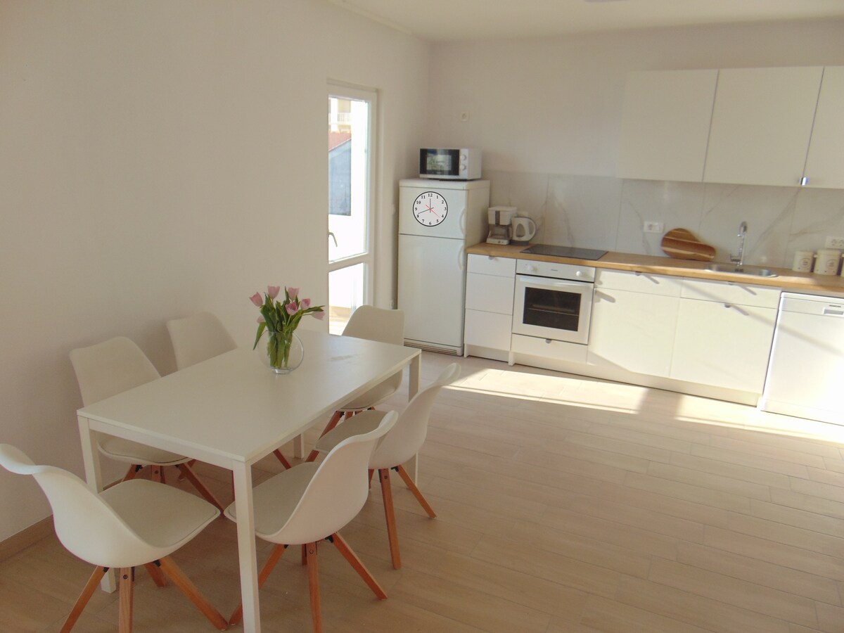 Este hermoso apartamento con capacidad para 5 personas es la puerta de entrada perfecta para tus vacaciones. El apartamento está situado en el último piso de la casa con vistas increíbles al mar y un acogedor balcón con una mesa y 6 sillas. Dos habitaciones con camas dobles y un lugar adicional para dormir en la sala de estar serán suficientes para un máximo de 5 personas. Lo que es extra es la increíble piscina junto a la casa, exclusivamente para tu uso ilimitado (privado), donde podrás disfrutar de las mejores vistas al mar directamente desde la piscina infinita.