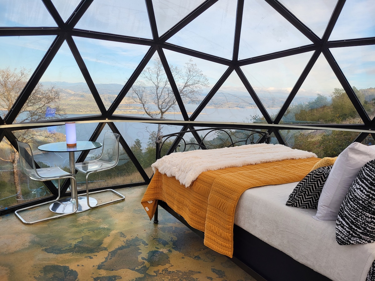 Glasshaus es una impresionante estructura de cúpula de vidrio diseñada para integrarse a la perfección con su entorno natural. La cúpula ofrece vistas panorámicas de 360 grados del majestuoso lago New Melones, las colinas circundantes y los cielos estrellados. Despiértate con los relajantes sonidos de la naturaleza y duérmete bajo una manta de estrellas.