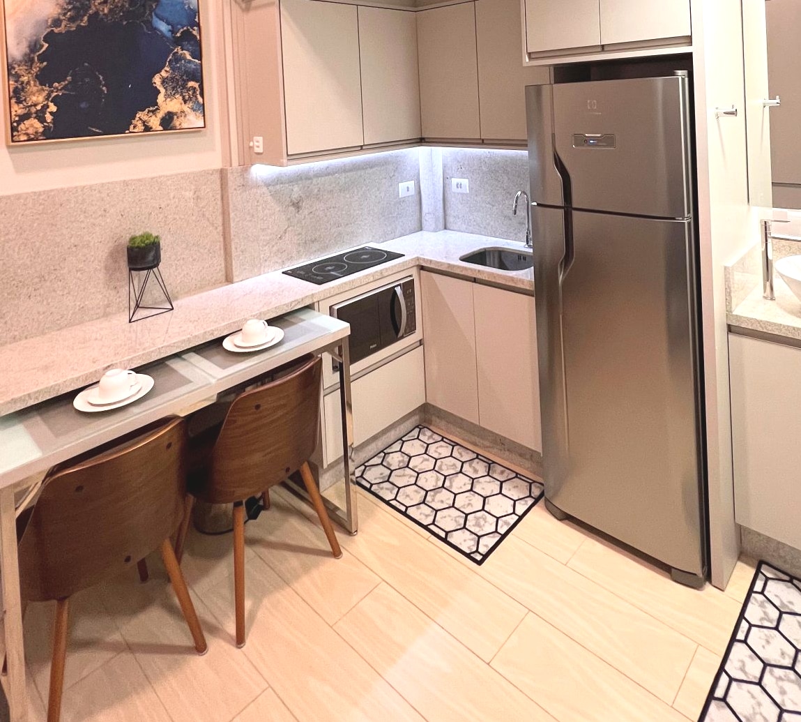 Heladera Electrolux Frost Free de 02 puertas con 382 litros Panel Blue Touch Inox y Gris. - DF42X (INOX, 110V). Microondas Electrolux MI41S 31 Litros Gris 110V Cooktop Fisher. Cama Box Matrimonial Maxflex Serie Premier Lujo. TV 43" Samsung Smart TV con NetFlix. Máquina de café Nespresso. Tetera eléctrica. Licuadora. Amplio armario con espejo en la puerta. Baño con ducha y estante con espejos. Cortina tipo romana doble. Apartamento con balcón con vista a la Serra do Mar. Internet. Sofá cama
