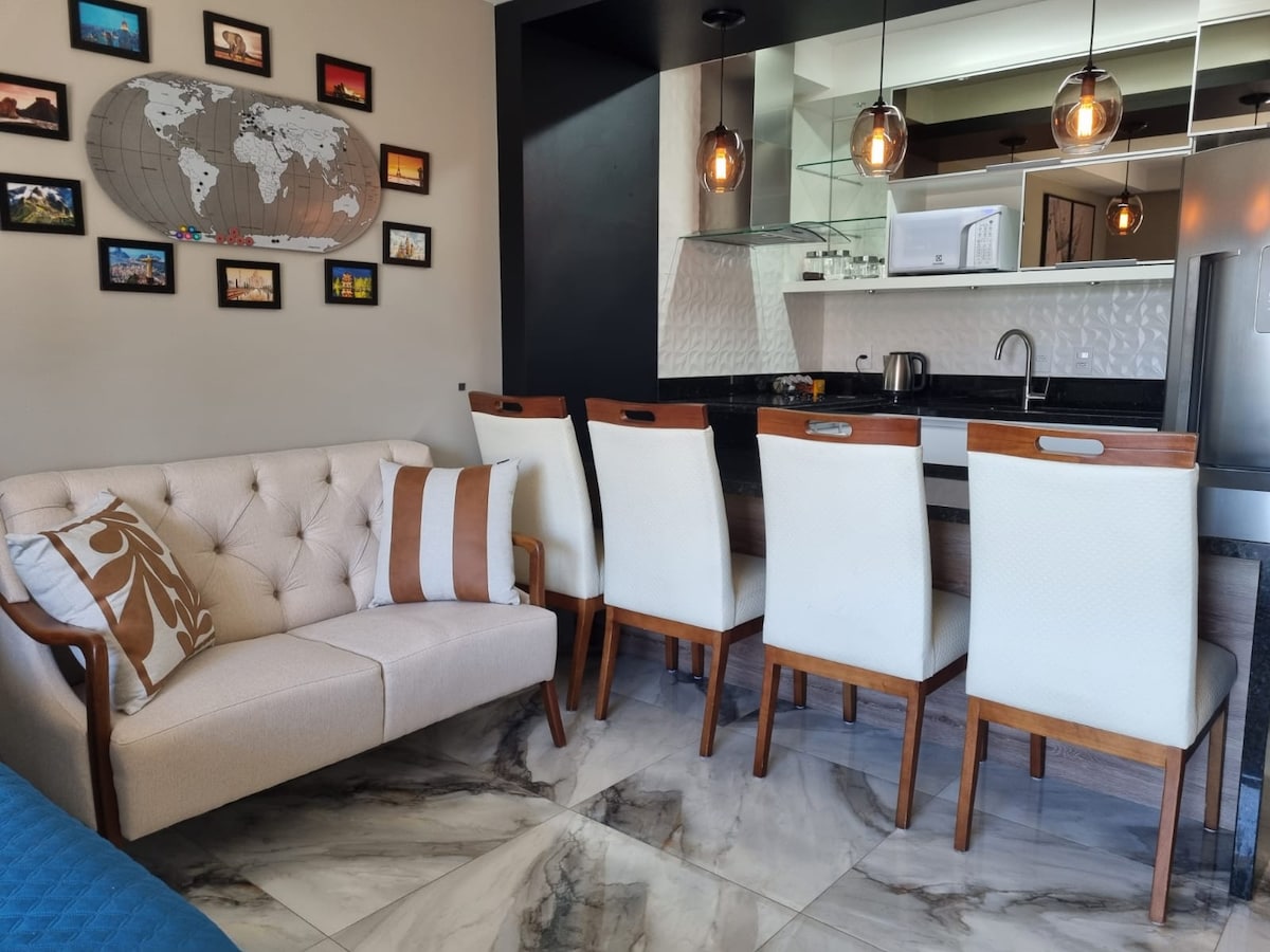 Estudio moderno, nuevo, acogedor, ubicación perfecta, con una hermosa vista desde el balcón, especialmente por la noche. Wifi rápido, escritorio, TV inteligente de 55”, cama Queen. Aire acondicionado (frío/calor). Lavadora y secadora y una hermosa isla en la cocina. 50m2 de mucho estilo-27ºandar, Silencioso. En el Centro/Batel, cerca de comercios, bancos, centros comerciales, polo gastronómico y Hospital. En el edificio: piscina, gimnasio, sala de juegos, sauna, jacuzzi, conserjería las 24 horas.