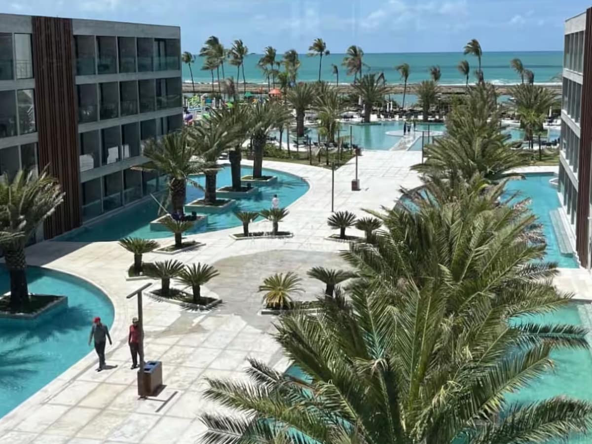 ¡Hasta 4 personas! ¡Pet Friendly! Muro Alto/Porto de Galinhas, frente a las piscinas naturales y con acceso exclusivo a la playa. Ubicado en la mejor zona de Muro Alto, con aguas tranquilas y cristalinas, ideales para familias y niños. • 1 cama queen + sofá cama acogedor. • Se aceptan hasta 2 mascotas pequeñas (tarifa adicional del resort por estadía). • Piscinas, spa, sauna, gimnasio, restaurante 24h y actividades diarias para adultos y niños. • Estacionamiento incluido.