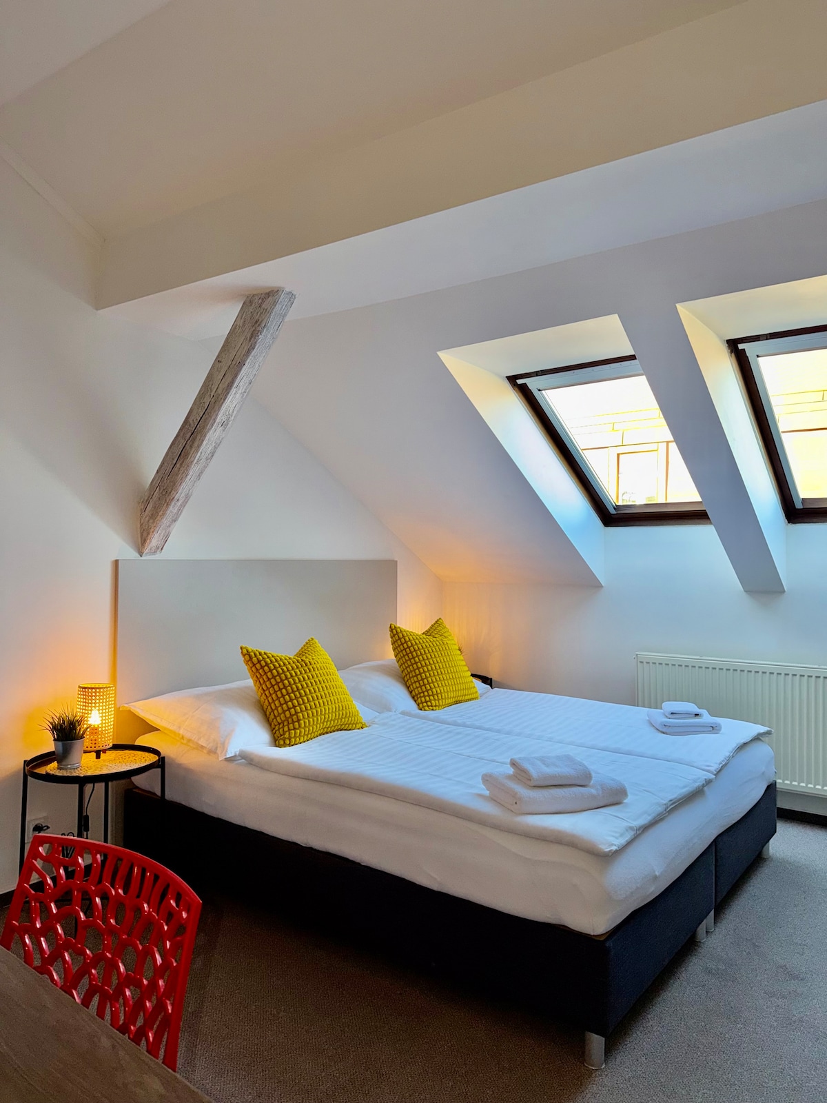 Disfruta de una vista carismática de la sinagoga de Jerusalén al lado desde la cocina de este elegante apartamento contemporáneo con una acogedora terraza/balcón adjunto. El papel pintado retro y el arte moderno añaden toques eclécticos y coloridos al interior cuidadosamente dispuesto. El apartamento de dos dormitorios ofrece todo lo que necesitas: cocina totalmente equipada con mesa de comedor, sala de estar con TV plana grande y un gran vestíbulo de entrada. ¡Vista carismática a la maravillosa sinagoga desde la ventana de la cocina! El apartamento está equipado con todo lo necesario para una cómoda estancia de hasta 6 personas: Cocina: - Nevera y congelador - Microondas - Horno, estufa - Lavavajillas - Hervidor eléctrico - Tostadora - Utensilios de cocina - Lavadora - Té, café, azúcar y sal - Productos de limpieza Sala de estar: - Mesa de comedor y sillas. - sofá plegable (muy cómodo para dormir para 2 personas) - TV con satélite Primer dormitorio: - Cama de matrimonio. - Armario para tu ropa. - Estantes para tus libros y revistas. - 2 sillones y mesa, perfectos para una agradable pausa para el café por la tarde Segundo dormitorio: - Cama de matrimonio. - vestidor y baño privado con ducha Primer baño: - Bañera. - Lavabo - aseo - Espejo de pared con buena iluminación - Secador de pelo - Toallas Segundo baño: - Ducha - Lavabo - Espejo de pared con buena iluminación - Secador de pelo - Toallas Aseo independiente junto al primer baño (accesible desde el vestíbulo de entrada). Terraza: - bonito banco de madera Se proporcionarán llaves del edificio y del apartamento a los huéspedes. El apartamento está preparado para el registro autónomo, lo que significa que te enviaré todos los detalles necesarios aproximadamente 1 semana antes de tu llegada. Siempre estaré disponible en mi teléfono en caso de cualquier duda o emergencia. El edificio se encuentra dentro de un tranquilo y acogedor patio en el centro principal de la ciudad, cerca de la sinagoga de Jerusalén. Es una ubicación muy atractiva, a pocos minutos del casco antiguo. Un corto trayecto en coche conduce a la estación central para tomar autobuses directos al aeropuerto. Desde el aeropuerto: Autobús AE desde cualquier estación del aeropuerto hasta la última parada Hlavni nadrazi (estación central). Está a 5 minutos a pie de allí. Si reservas mi apartamento, se te proporcionará: - sábanas, mantas y almohadas limpias; - toallas limpias, dos por huésped (más toallas bajo petición).