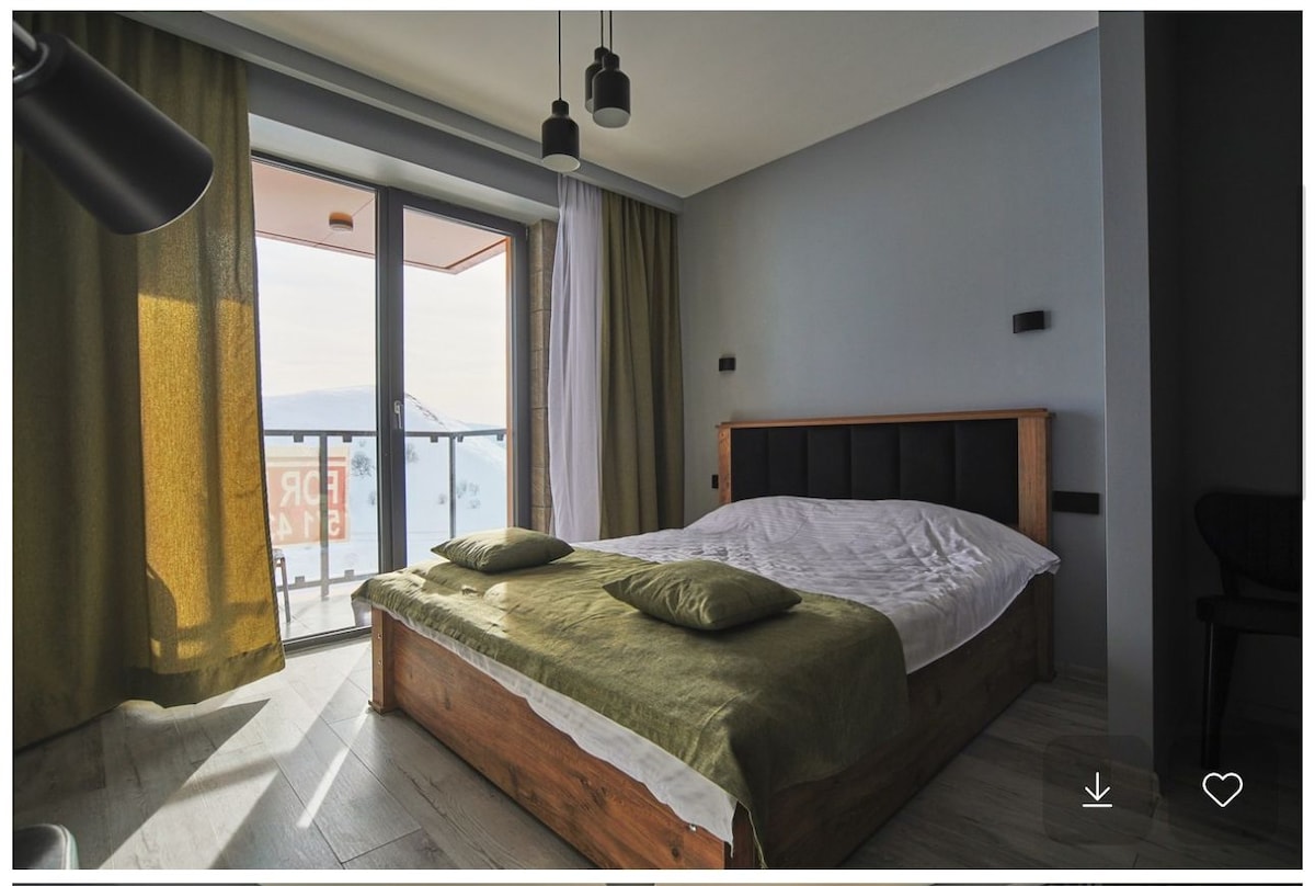Unwind in this stylish retreat, surrounded by the New Gudauri Mountains. This spacious apartment features two interconnected bedrooms, two sofa beds, two bathrooms, and a convenient kitchenette. NOT fully functional kitchen. Ideal for remote work or relaxation, it includes two dedicated work desks and offers breathtaking mountain views. Enjoy seamless ski-in/ski-out access with ski lockers in the basement and direct access to the main New Gudauri Gondola. Building name is LOFT 2