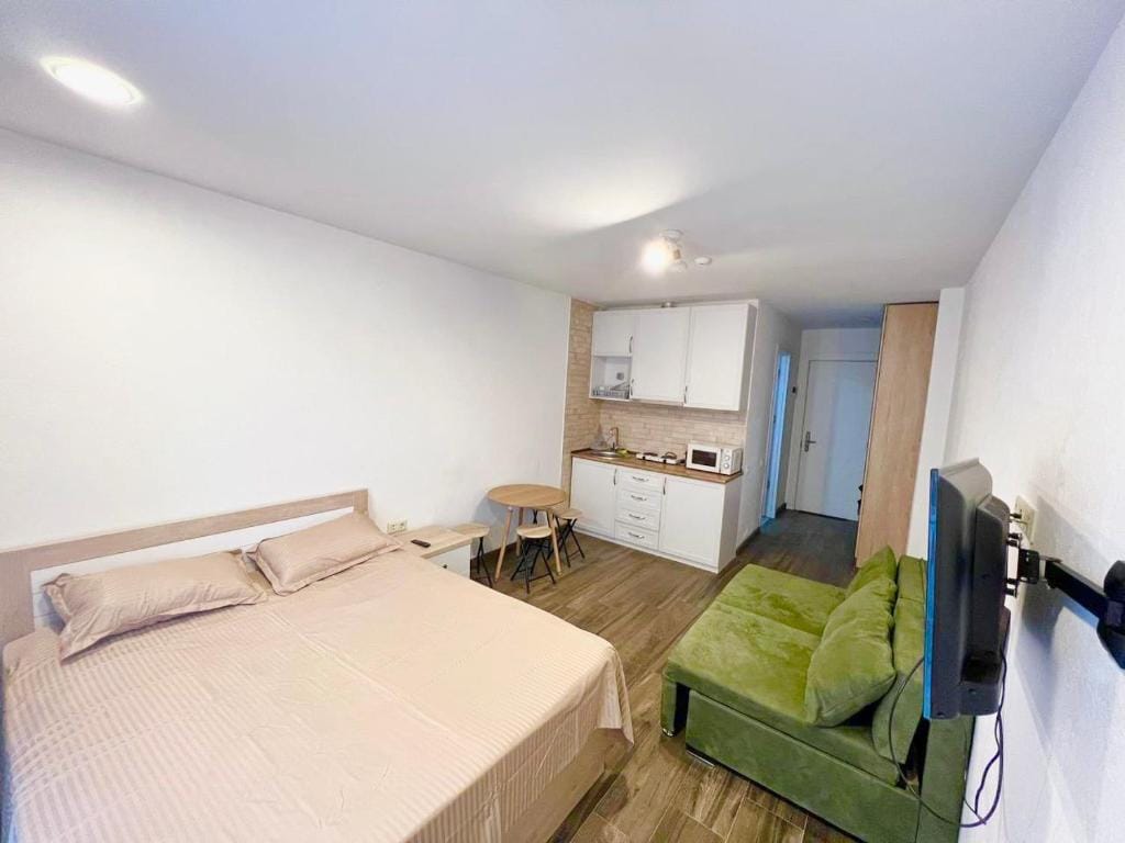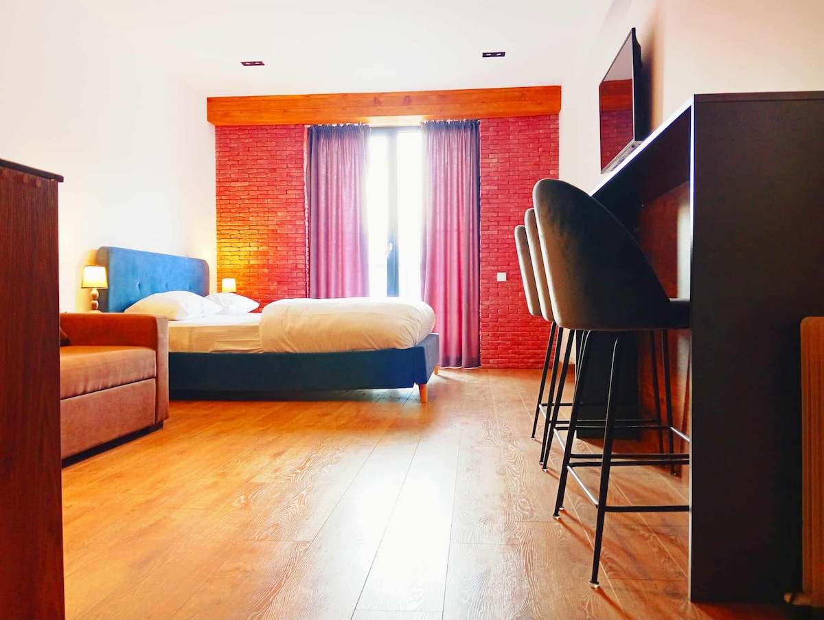 Acogedor estudio con cama tamaño king, dos sofás cama individuales y un sofá cama doble. El edificio tiene una excelente ubicación, está justo al lado del ascensor de góndola.