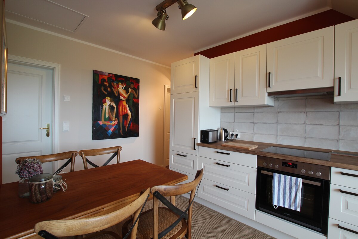 En una gran propiedad en una ubicación ideal orientada al sur, el apartamento está situado directamente en la costa empinada de la laguna de Szczecin. El apartamento está arriba. ¡Desde la amplia terraza tienes excelentes vistas a la Laguna Szczecin! Muebles de muy buen gusto con mucho amor por los detalles. En el anexo Sauna- fitness- masaje- salas comunes, sala de juegos para niños pequeños, billar, tenis de mesa. Haffterrasse to Chill, BBQ area, parque infantil y mucho más.. Accesible con ascensor.