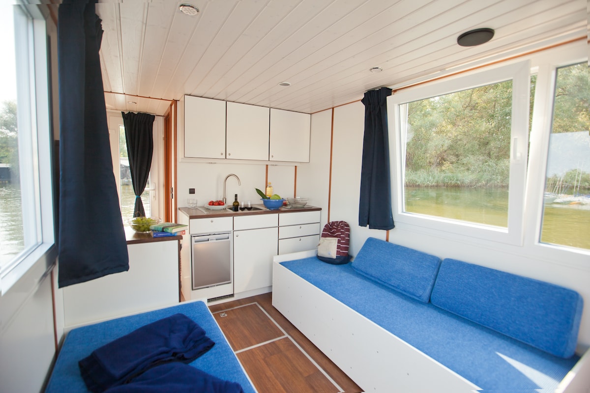 Casa flotante Fru Püttelkow ¡Sumergirte de la vida cotidiana puede ser así de fácil! Firmemente anclado en las olas, Fru Püttelkow ofrece todo lo que tu corazón desea con un espacio habitable completo y de alta calidad (33 m²) y dos terrazas para tomar el sol (unos 25 m²).
