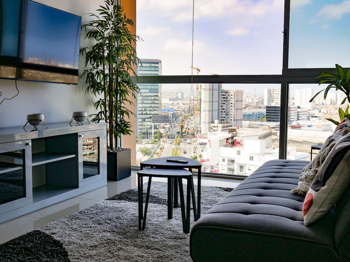 Very practical apartment. Bedrooms furniture is costume made by Kuni Peru with a beautiful wooden plating, very creative and unique. The night stand lamps have usb ports and have perfect lighting for night reading. The living room and bedrooms lead to balconies with views of Miraflores, La Paz St. and Diez Canseco St. and have floor to ceiling canceling sound sliding screens. The couch is American made and is extremely comfortable. 24 hour convenience store literally in front of the building.