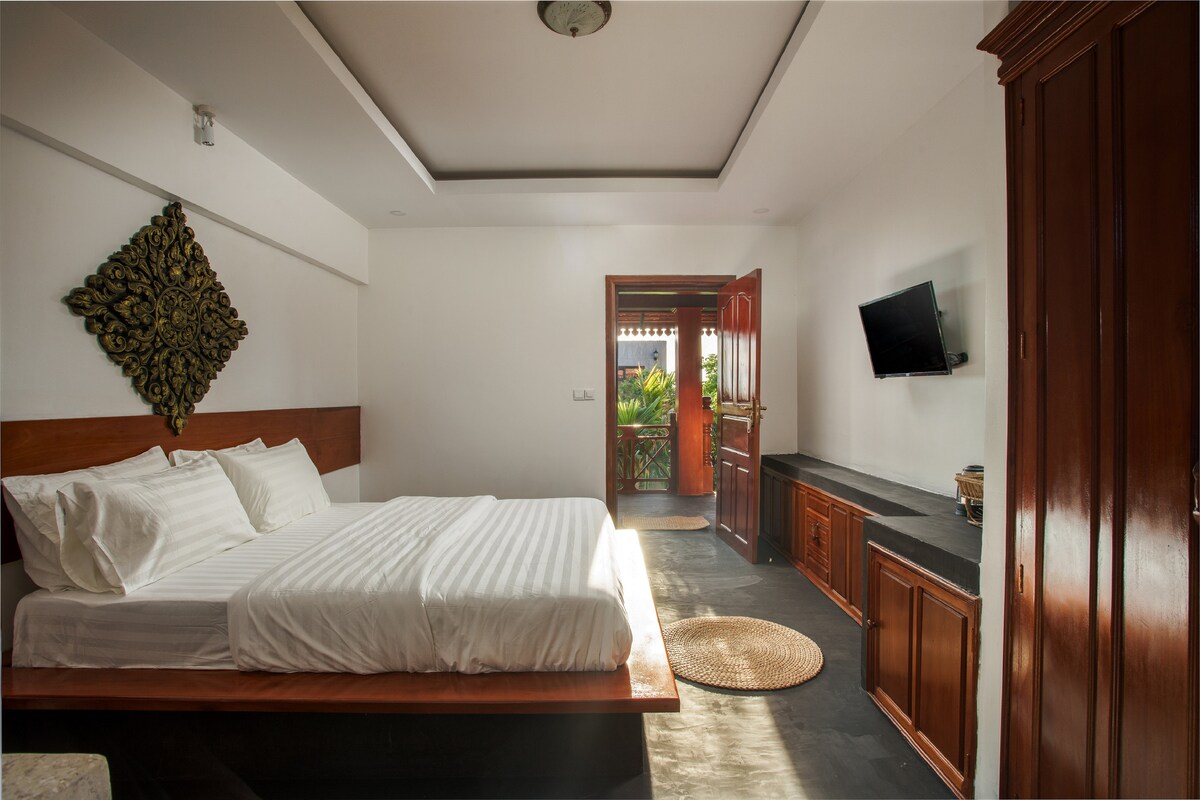 Unique Design, Large bedroom fully decorated, All 4 king-size Room with balcony to pool, sofar for sitting area, this Art House comes up with Private Pool, Dining Room, Kitchen, Sitting Area, Garden and Parking, the beautiful villa in Siem Reap Angkor. Locates in quiet place, close to Angkor temple, 10 minutes walking to restaurant, Cafe, Supermarket. All Rooms spacious, big bathroom with separate shower, bathtub, toilet Room, full amenities like Aircon, ceiling fan, writing desk, TV and balcony