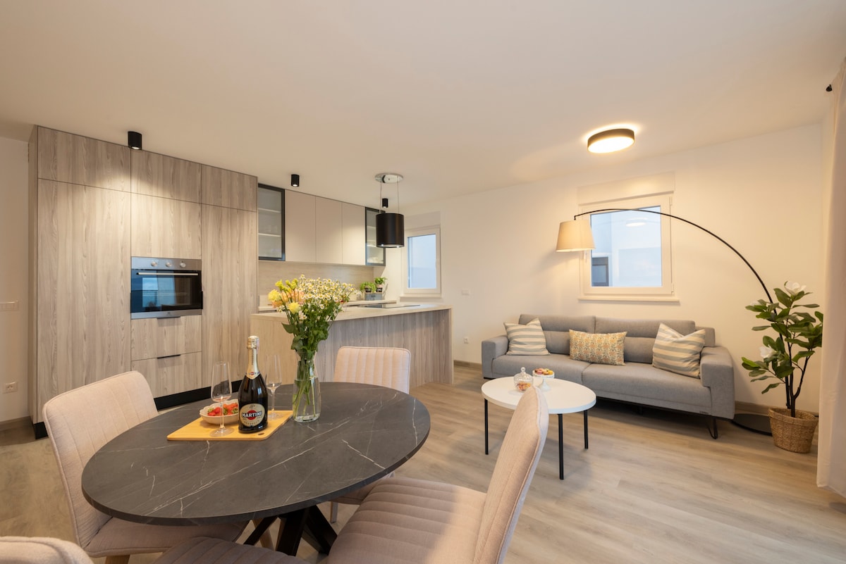 The apartment were completed 2022. Apartment is 100m² which includes a luxury bedroom with a 200x200cm boxspring bed and en suite bathroom, fully equipped kitchen, large lounge and extra toilete. The large covered balcony offers superb views of the harbour and old city also a beautiful jacuzzi 220x220cm, sun lounges and a shower. Covered parking is in front of the building. Distance to the harbour is 500m and 800m to the main beach. We look forward to hosting you soon. Tina