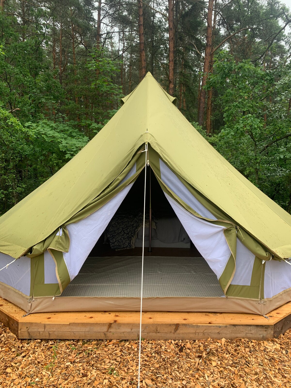 En un borde del bosque de nuestra granja con vistas a vastos campos, puedes disfrutar de la privacidad rodeado de ramas y follaje de los árboles. El sencillo edificio se encuentra en una meseta a 2-3 metros sobre el suelo entre los troncos de los árboles. Las ramas de los árboles forman un techo sobre la pequeña terraza con una sencilla cocina al aire libre frente a la tienda. Estás completamente desconectado, pero tienes acceso a refrigeración y electricidad en nuestra granja donde estacionas, o puedes pedir prestada una nevera para llevar comida. A cien metros del alojamiento hay un baño privado con retrete seco y ducha exterior.