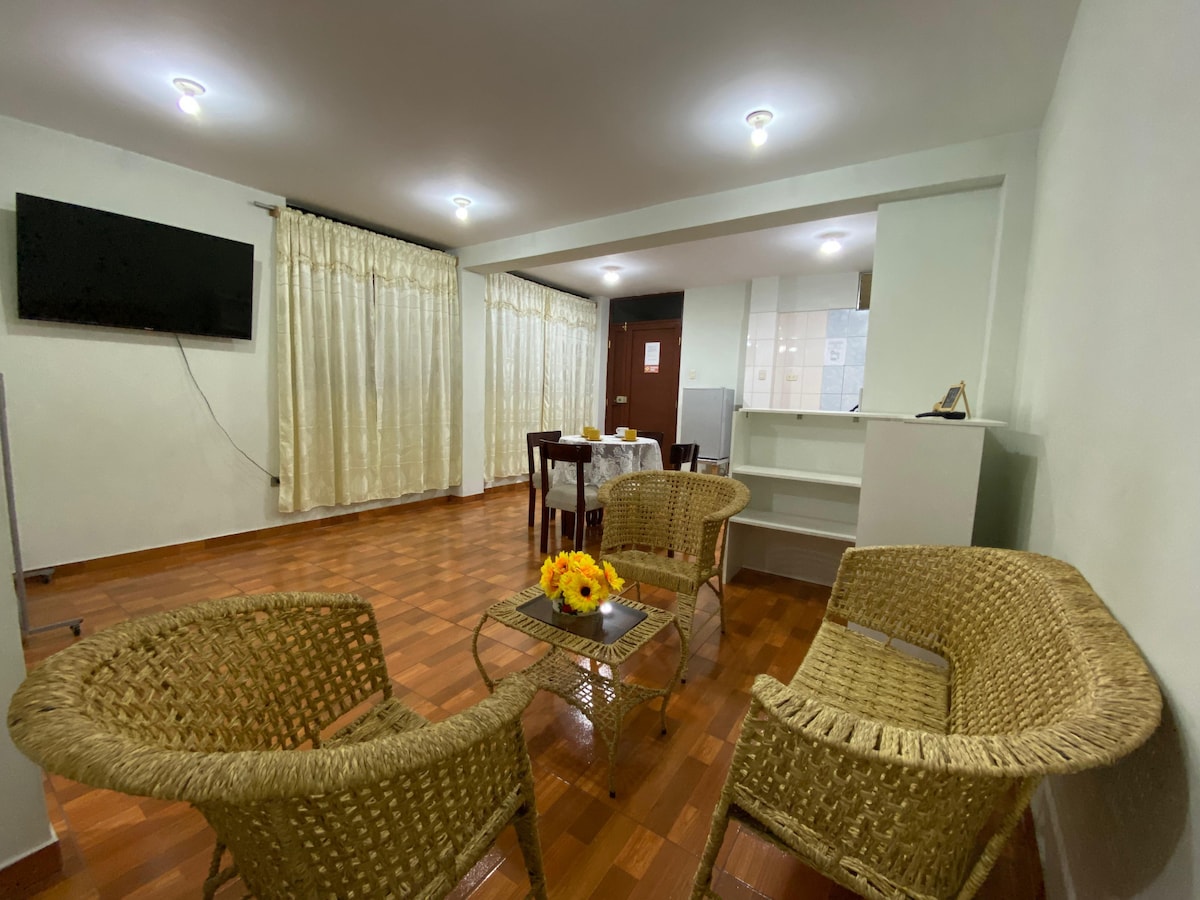 Av. Pinto, cerca de zona comercial, restaurantes y transporte. En 3er piso, con excelente iluminación natural, ventilación y tranquilidad. Cuenta con 2 habitaciones con camas de 2 plazas, sala-comedor con sofá cama, cocina equipada y baño completo. Incluye Wifi, Smart TV, agua caliente, ropa de cama, toallas y amenities. Ideal para hasta 4 personas.