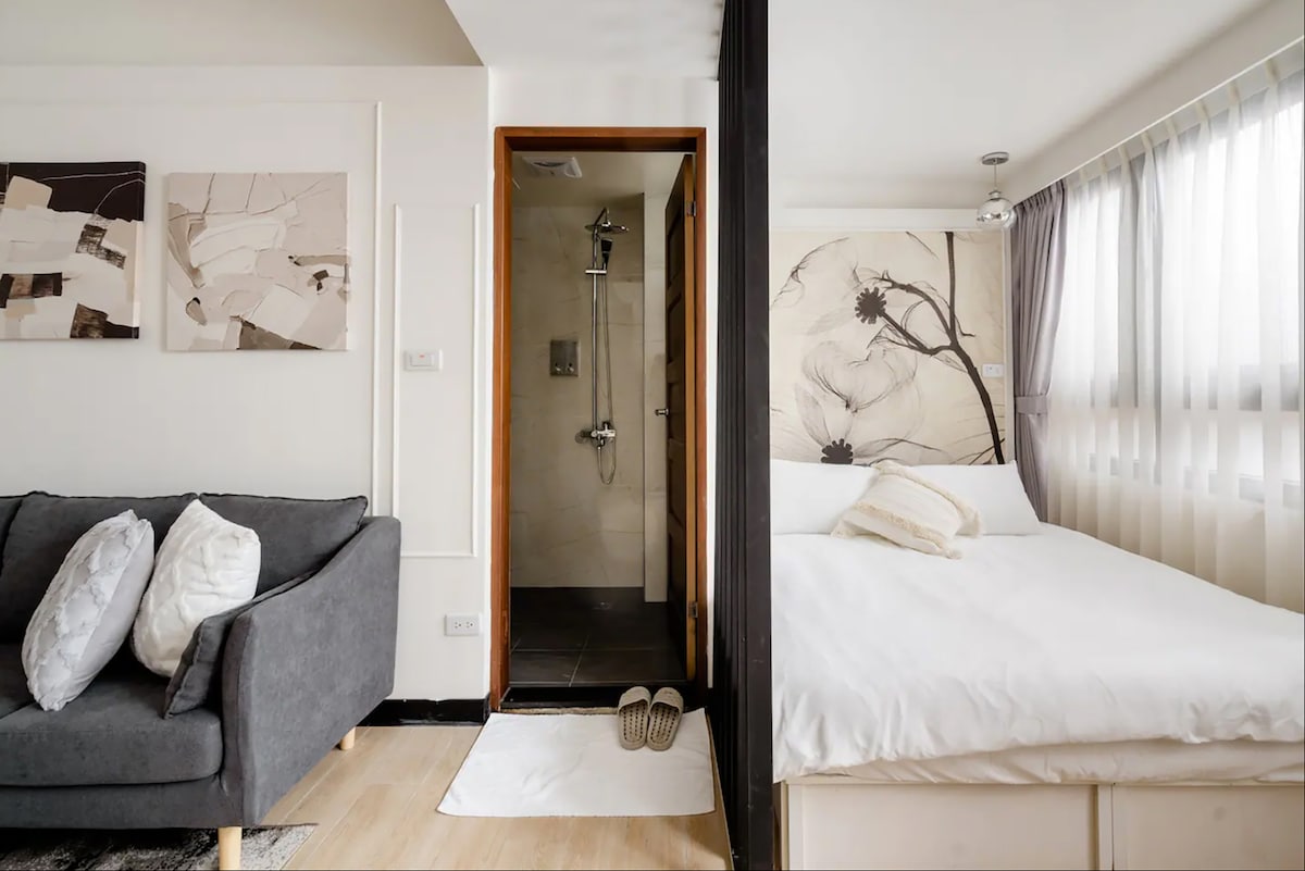 室內的灰白主色,配搭北美木紋銅色傢俱及家飾, 用心為您的居住空間提供沈靜優雅的感覺。日韓系電器的選用,不論是無線充電藍牙喇叭 ,大螢幕伸縮高清電視 ,都能滿足您對影音效果的要求。房源位於高樓內縮樓層,阻絕不必要的噪音並滿足您對景觀 ,安靜及隱私的要求。大樓並配有全天候警衛,住戶專屬電梯 ,公用大露台 ,以及地下收費停車場, 位處西門町核心路段,無論搭乘捷運或自駕都非常方便。El diseño interior basado en el tono de la tierra ofrece una atmósfera cálida, tranquila, curativa y encantadora. Instalaciones de la habitación, incluyendo cama doble, baño privado con ducha, aire acondicionado, televisor inteligente 4K con películas/Netflix, Internet WIFI, iluminación de la cala y reproductor de música con conexión inalámbrica y puertos de cargador USB.