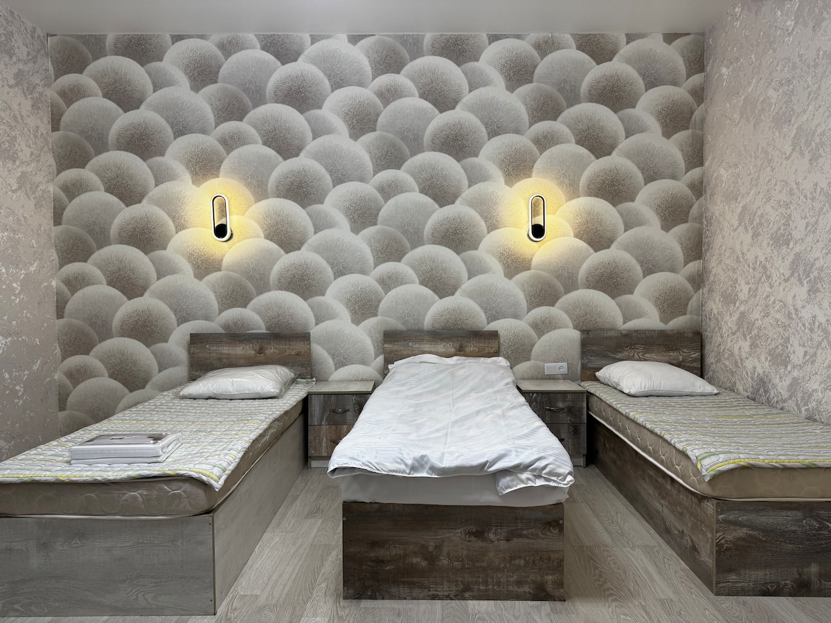 Stylish Loft Apartment in the Heart of Dushanbe Welcome to our newly renovated loft apartment, a modern and comfortable space designed to make your stay in Dushanbe unforgettable. The apartment features a stylish interior, quality furnishings, and all the amenities you need for a relaxing visit— for business or leisure. Located in the center of the city, just steps away from popular restaurants, cafés, banks, shops, and a supermarket. Everything you need is right at your doorstep.
