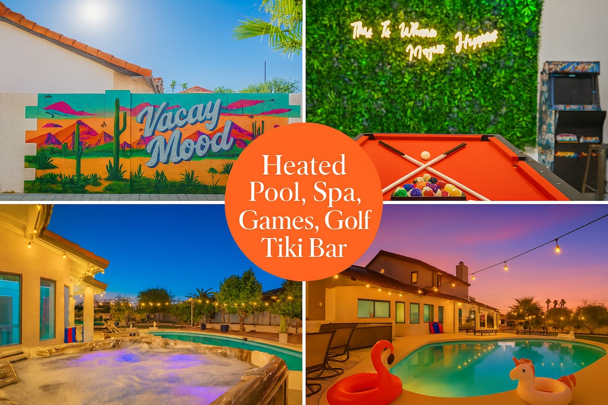 ¡Nueva CASA! ¡Marzo de 2024! ¡PISCINA CLIMATIZADA GRATIS EN INVIERNO Y JACUZZI + CERO TAREAS DE LIMPIEZA! ¡NO PAGUES POR LA CALEFACCIÓN DE LA PISCINA EN EL AIRBNB DE OTRA PERSONA! - NUEVA y hermosa casa remodelada de 3 dormitorios con patio trasero estilo resort, ¡a solo minutos del casco antiguo de Scottsdale! Piscina climatizada gratuita, jacuzzi, chimenea, minigolf, ping pong, ajedrez gigante, wifi más rápido y televisores inteligentes. La casa está totalmente equipada con una barra de café de cortesía, barbacoa al aire libre y el césped más hermoso para que toda la familia disfrute. ¡TV POR CABLE!