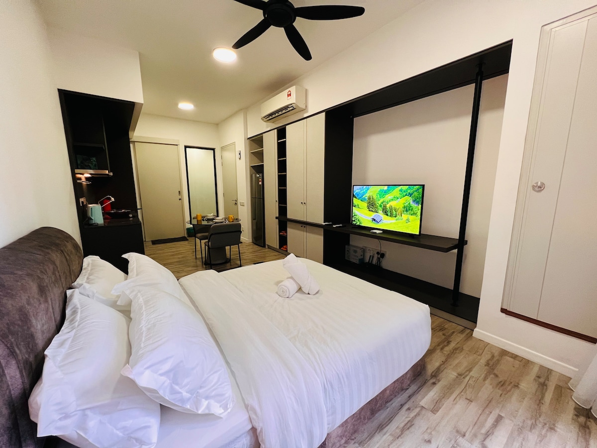 Modern 1-bedroom apartment with a private study—ideal for expats, remote workers, or small families. Enjoy a cozy bedroom, spacious living area with a 50" smart TV, full kitchen, in-unit washer/dryer, and fast Wi-Fi. The private study is perfect for working remotely or kids' homework. Located near dining and shops, this is your comfortable home base in Millerz Square, Kuala Lumpur.
