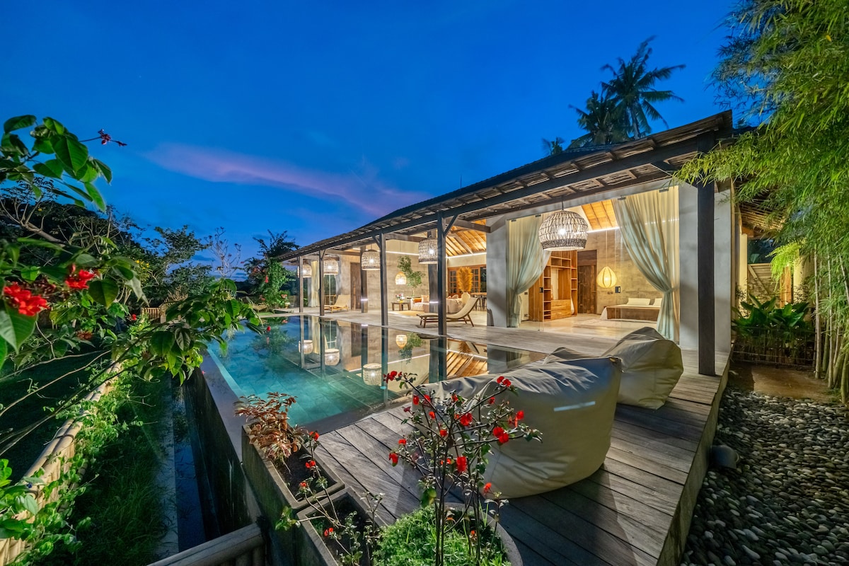 Esta es una casa natural bellamente diseñada que se abre a amplias vistas al campo de arroz en la parte delantera, con un baño escondido en la exuberante selva verde en la parte posterior. Cuando te relajas en las sillas de la terraza delantera, escuchas el poderoso océano justo más allá de las palmeras y, en la parte trasera de la casa, puedes escuchar el relajante flujo del río. El espacio está diseñado con límites fluidos entre el interior y el exterior, manteniéndote conectado con la naturaleza sin dejar de estar cómodo.