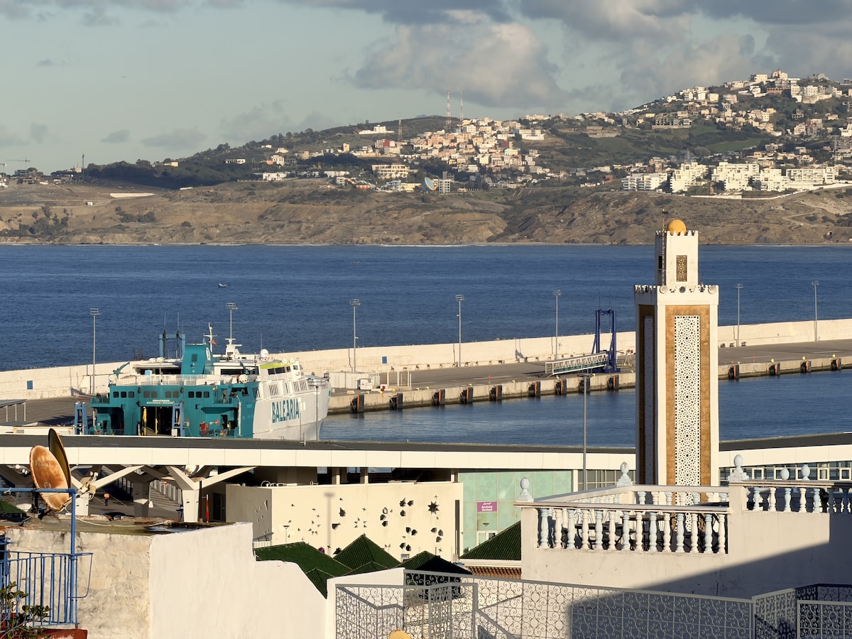 Bienvenido a nuestro encantador apartamento de 3 dormitorios ubicado en el vibrante corazón del hipercentro de Tánger. Todas las comodidades necesarias están disponibles: aire acondicionado, Smart TV, Netflix, conexión a Internet de fibra óptica, cafetera, toallas, artículos de aseo, etc. Ubicado en el último piso del edificio con acceso a ascensor, estás a solo unos escalones de acceder a la increíble azotea y admirar las impresionantes vistas de Tánger, España, el estrecho de Gibraltar y las montañas de Chefchaouen.