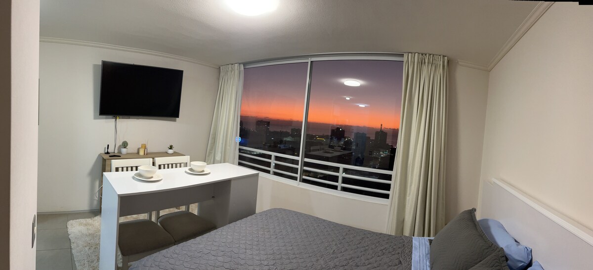 Departamento de dos ambientes con habitacion cama matrimonial y baño equipado. Living comedor con cocina full equipada. smart tv , wifi y balcones mirando a la ciudad en altura piso 11 . Ubicado a pasos de playa Cavancha y a dos cuadras de los mas variados restaurantes. Cercano a Mall Plaza Iquique. Emplazado en un lugar seguro , tranquilo y expedito, además ubicado en avenida con bastante locomoción.