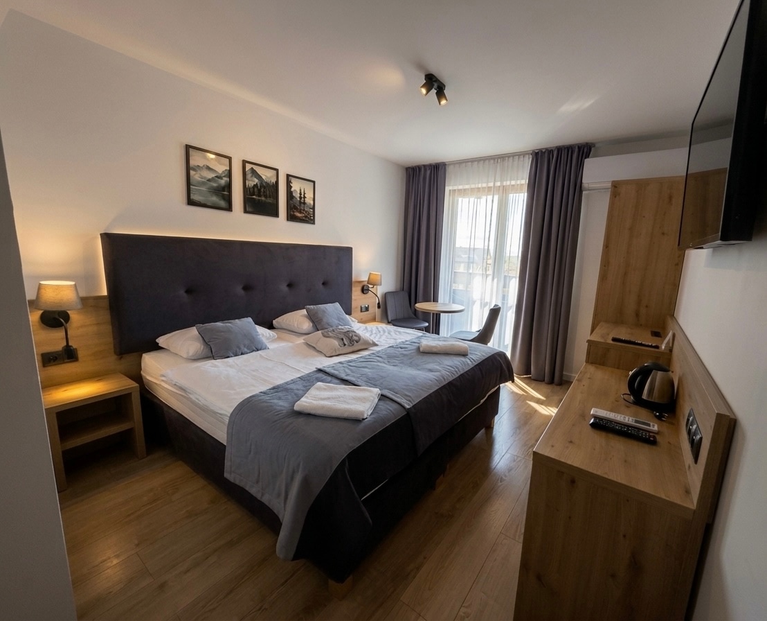 Klimatyzowany, piękny apartament z widokiem na Tatry. Wyposażony aneks kuchenny, łazienka, przestronny salon oraz sypialnia z wygodnym łóżkiem pozwolą na efektywny wypoczynek po górskich zdobyczach. Przynależy do niego balkon z pięknym widokiem na Giewont.