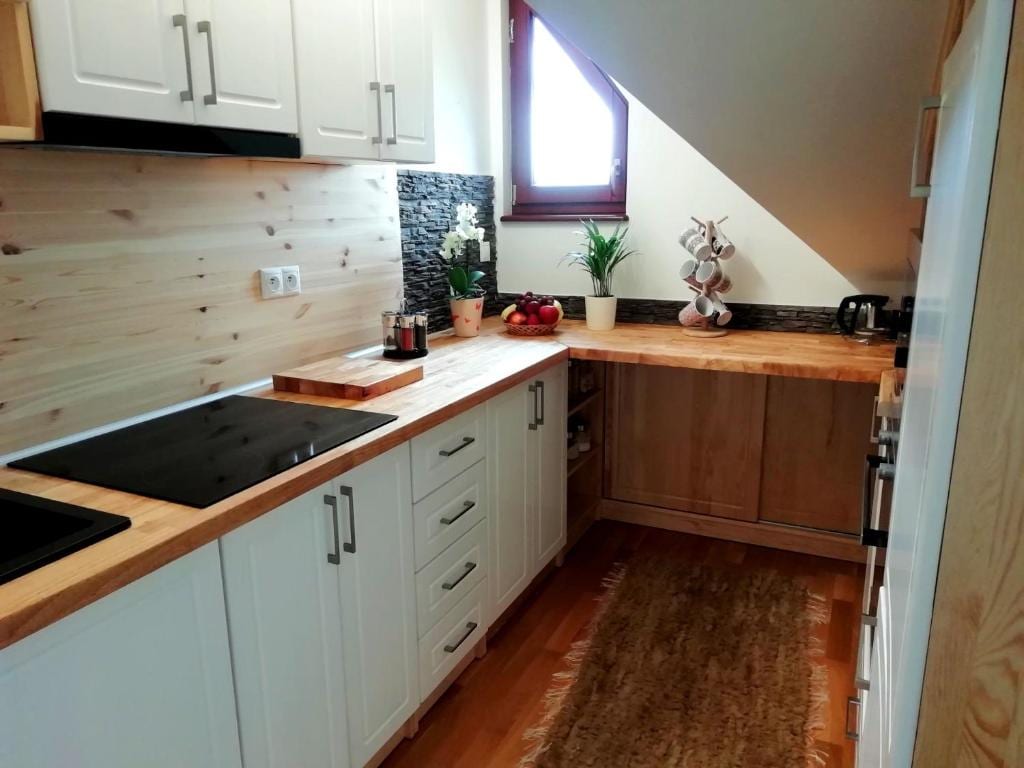 El apartamento Thomas ofrece la planta baja con un loft, donde en la planta baja hay una cocina americana, sala de estar y baño. Un dormitorio espacioso está ubicado en el loft. Es posible desplegar un sofá de cuero en el apartamento, desde el que se creará una cama adicional de tamaño completo (para un máximo de 2 personas). El precio de la estancia incluye DESAYUNO y sauna privada con baño, un sendero Kneipp al aire libre (solo en los meses de verano), un parque infantil multiusos (tenis, voleibol), una parrilla eléctrica WEBER, la posibilidad de usar un parque infantil o pelotas para niños.