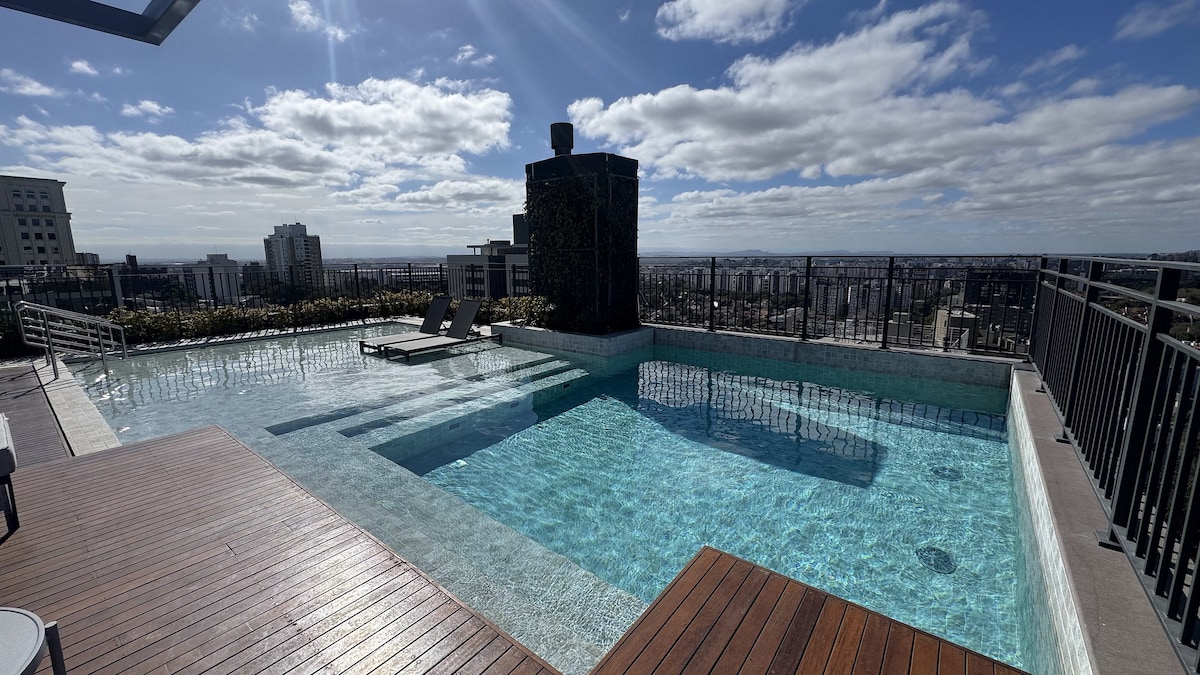 Disfruta de una experiencia elegante en este lugar ubicado en un noble barrio de Porto Alegre, cerca de Parcão y del centro gastronómico y nocturno de la calle Nueva York. Loft nuevo y elegante con cocina y 100 % equipado: wifi, aire acondicionado, televisor inteligente de 50 pulgadas con canales abiertos, estufa, freidora de aire, minibar, microondas, platos, cubiertos, ollas, tazones y utensilios. Condominio con piscina climatizada en la azotea, lavandería, mercado 24 horas, mesa de billar, espacio zen, espacio de coworking y gimnasio. No se permiten fiestas.