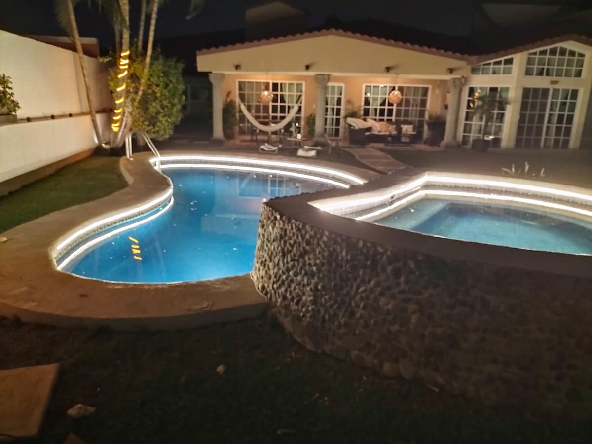 Casa privada con alberca grande, escapa del frío y disfruta con el agua caliente en la piscina entre 31° y 35° sin costo adicional. Cuenta con un amplio jardín y estacionamiento con espacio para 5 carros. Internet de alta velocidad a 300Mb, que puedes utilizar para tú trabajo en casa o ver tus series y películas favoritas desde PLEX, Disney+, Star+, Prime, HBO MAX y Crunchyroll. Ven y celebra tú cumpleaños, la casa es ideal para viajes en grupo o familias grandes.
