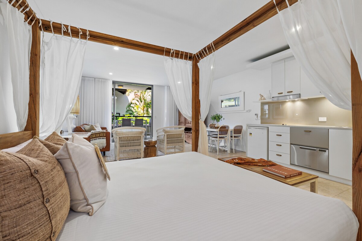 Saltwood Studio es perfecto para parejas y viajeros solos que buscan un espacio especial para relajarse y desconectar. Simplemente sal de tu balcón privado para disfrutar del gran jacuzzi exterior, las impresionantes piscinas y los jardines tropicales del magnífico Santai Resort, de inspiración balinesa, en Casuarina, Nueva Gales del Sur. El estudio es uno de los pocos estudios del centro vacacional que está absolutamente junto a la piscina. Es simplemente precioso cuando hace sol, pero también muy acogedor cuando hace más frío o llueve y es absolutamente impresionante por la noche.