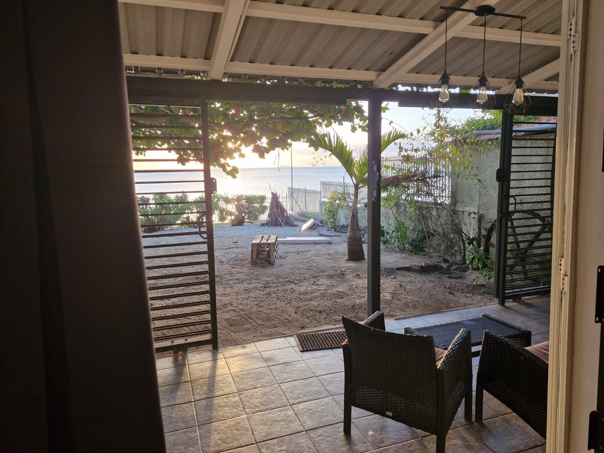 A beach apartment with a common enclosed sandy garden that leads to the seafront. Our 50 year old Badamier tree extends the veranda by covering the sand stretched courtyard from too much sun. Inside is a fully equipped kitchen, living space, homely bedroom and spacious bathroom. A parking in the front yard ensures the safety of cars from the road. The services from a cleaner, who comes 5 times a week, is offered She does laundry and freshens up the studio during your stay.