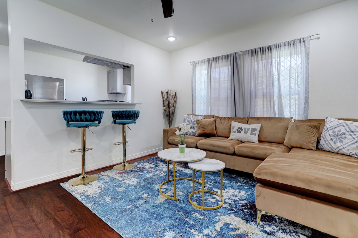 Step into 'Midtown Abode', a modern and stylish 3BR home in the heart of Houston. This property boasts two separate living areas and a beautifully landscaped outdoor space, perfect for relaxation or entertaining. Unwind in the hammock, enjoy evenings by the firepit, or indulge in the standalone tub in the spacious master bath. Ideal for families or groups, this home offers a serene escape with the convenience of a central location. Experience comfort and style on your next city getaway