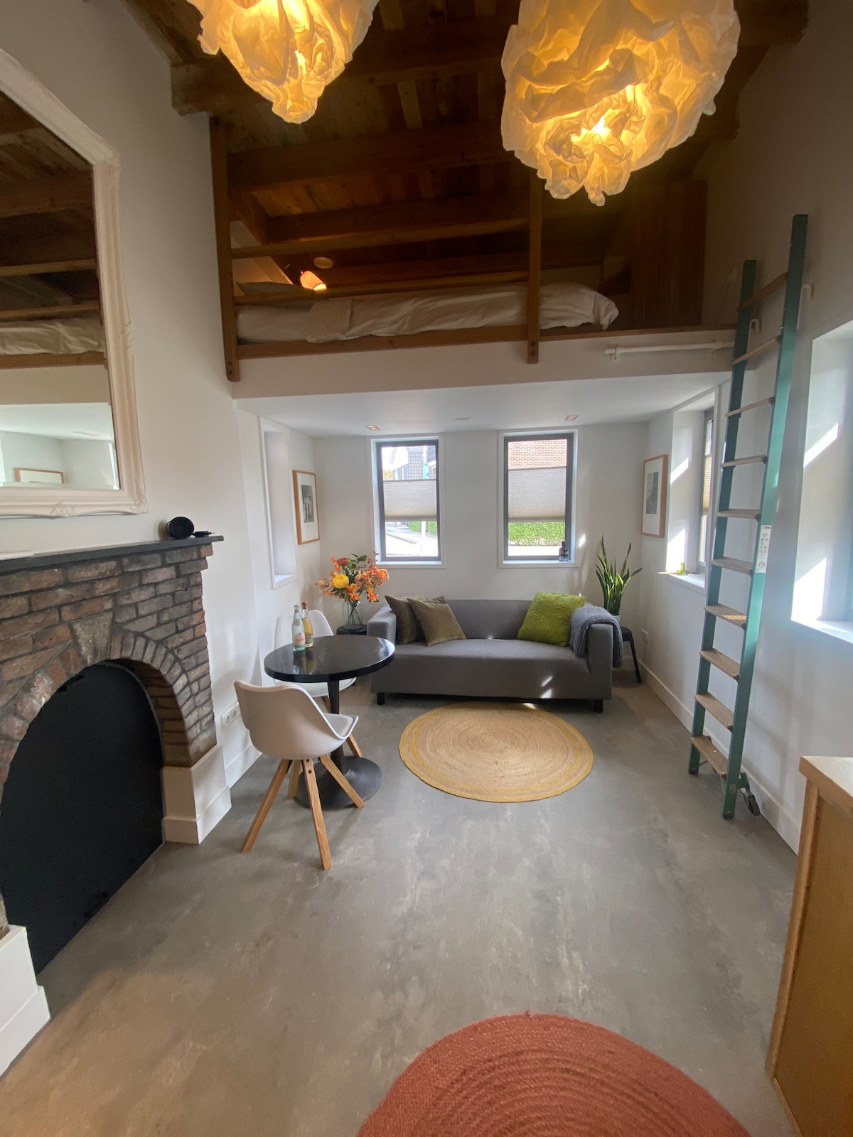 Relax and unwind in this peaceful, mid-century inspired vacation studio. A lovely studio with a spacious living room, private (separate) bathroom, sleeping loft (note: narrow steep staircase) and private outdoor terrace with seating and parasol. The studio has a spacious kitchen counter with various kitchen facilities. The studio is remarkably light through the many windows. Please note: due to the narrow and steep stairs to the sleeping loft, it is not suitable for the elderly or disabled.