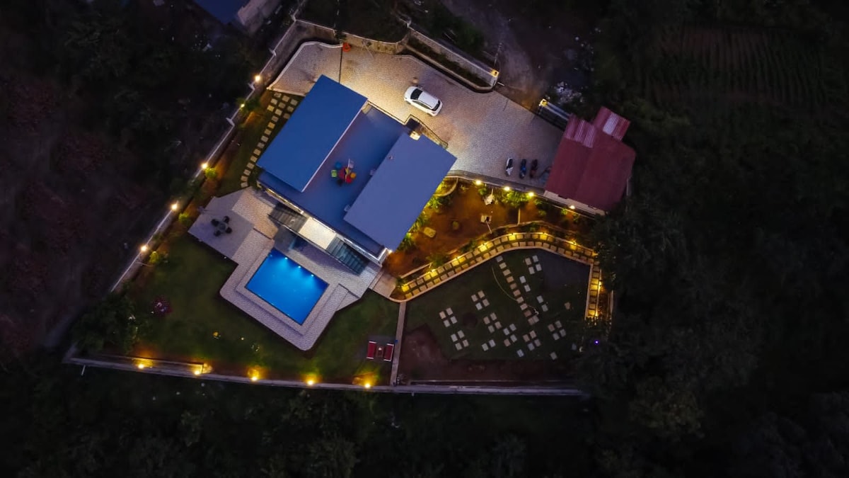 'Villa Elsewhere' es una lujosa y hermosa villa con piscina privada, a solo 60-90 minutos en coche de Bombay. Rodeado de exuberantes vistas verdes de campos, colinas y sonidos de la naturaleza. La villa tiene 3 dormitorios con aire acondicionado en suite, una gran sala de estar con aire acondicionado que se abre a una piscina privada y una gran terraza con un bar. La cocina está totalmente equipada donde un chef puede preparar comidas deliciosas (* cargo adicional). Se admiten mascotas (* tarifa adicional). ¡RESERVA para relajarte en un ambiente tranquilo, para una reunión o para organizar la mejor parte de la historia!