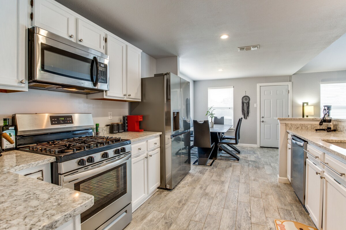 Hermosa casa con todo lo necesario para sentirse como en casa. Cocina totalmente equipada con todos los elementos esenciales para preparar comidas. La cocina tiene vistas a la sala de estar que cuenta con un televisor de 70 pulgadas. Después de sumergirte en la bañera del jardín, relájate en el colchón tamaño king en el dormitorio principal. El dormitorio de invitados cuenta con una cómoda cama tamaño queen. La zona del patio está lista para asar a la parrilla. A pocos minutos del NUEVO Grandscape, The Star en Frisco, Legacy West, la sede de Toyota y muchos otros restaurantes y entretenimiento.