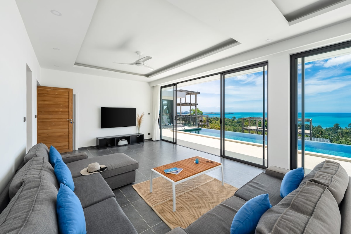 Villa privada de lujo de 620 m² con vistas al mar de 180° sobre las colinas de Chaweng → Desayuno y limpieza diarios. Piscina infinita de→ 25 metros de altura. → Gimnasio, billar, dardos y tenis de mesa → Hospitalidad con personal 24/7 en el lugar (inglés, tailandés) Bañera de hidromasaje de→ hormigón → Cada dormitorio con baño privado Internet → de alta velocidad y wifi → Televisión inteligente con Netflix Sistema de sonido→ Bose → Café y agua potable gratis → Agua y electricidad incluidas → 10 millones en auto a las playas → Más servicios disponibles bajo petición