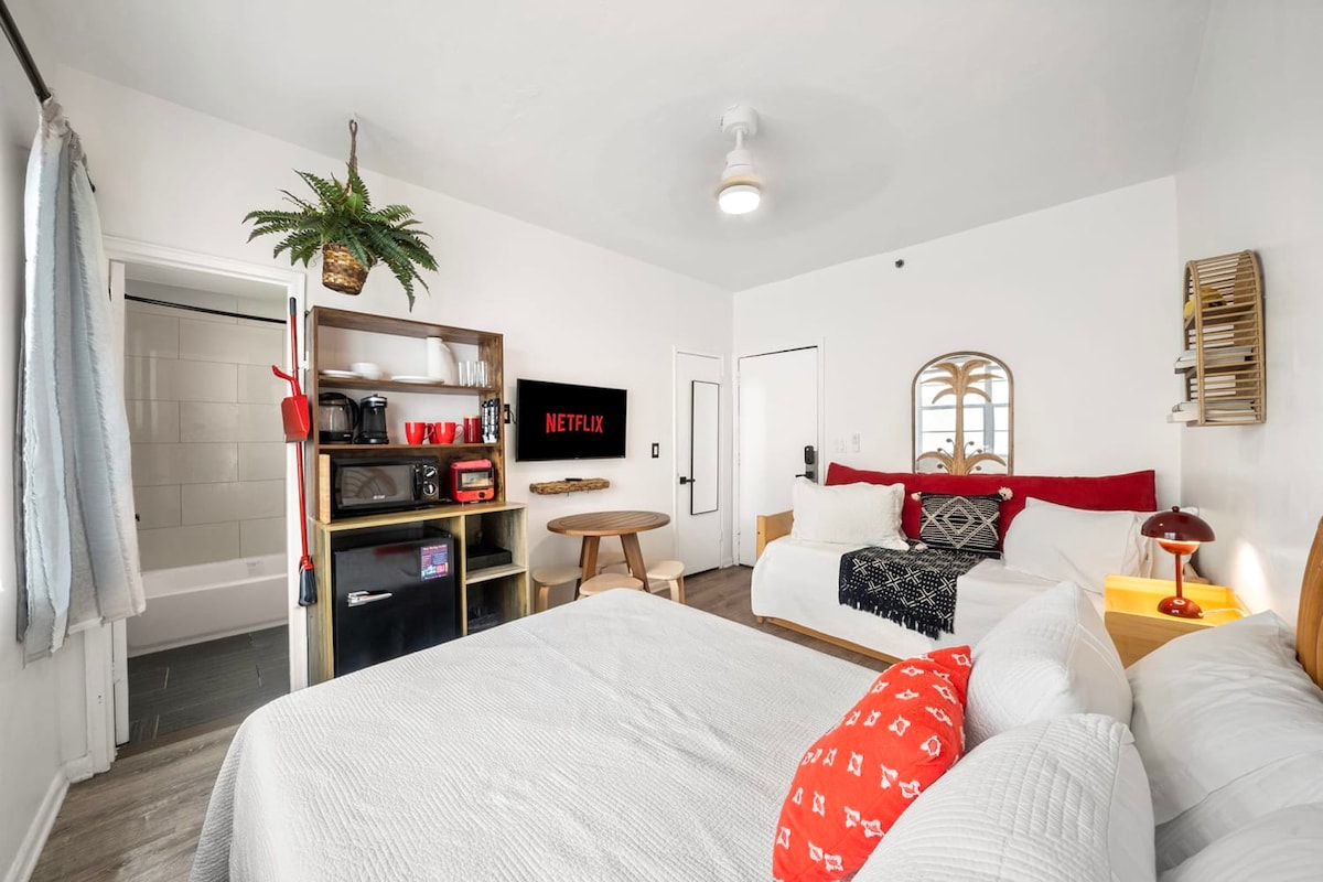 ¡Alójate en South of Fifth, el barrio más encantador de Miami Beach, a solo una cuadra de la playa! Esta acogedora unidad cuenta con una cama tamaño king, TV inteligente, Wi-Fi, aire acondicionado, espacio de trabajo, nevera, plancha, secador de pelo y ropa de cama de primera calidad. Disfruta de servicio a la habitación, café en el vestíbulo, entrega de equipaje, cuna a pedido y comedor al aire libre. Perfecto para relajarse después de un día al sol. Camina a los mejores restaurantes, parques y el océano en minutos. A petición, se proporciona estacionamiento a dos cuadras del hotel en un garaje cerrado por $20/día.