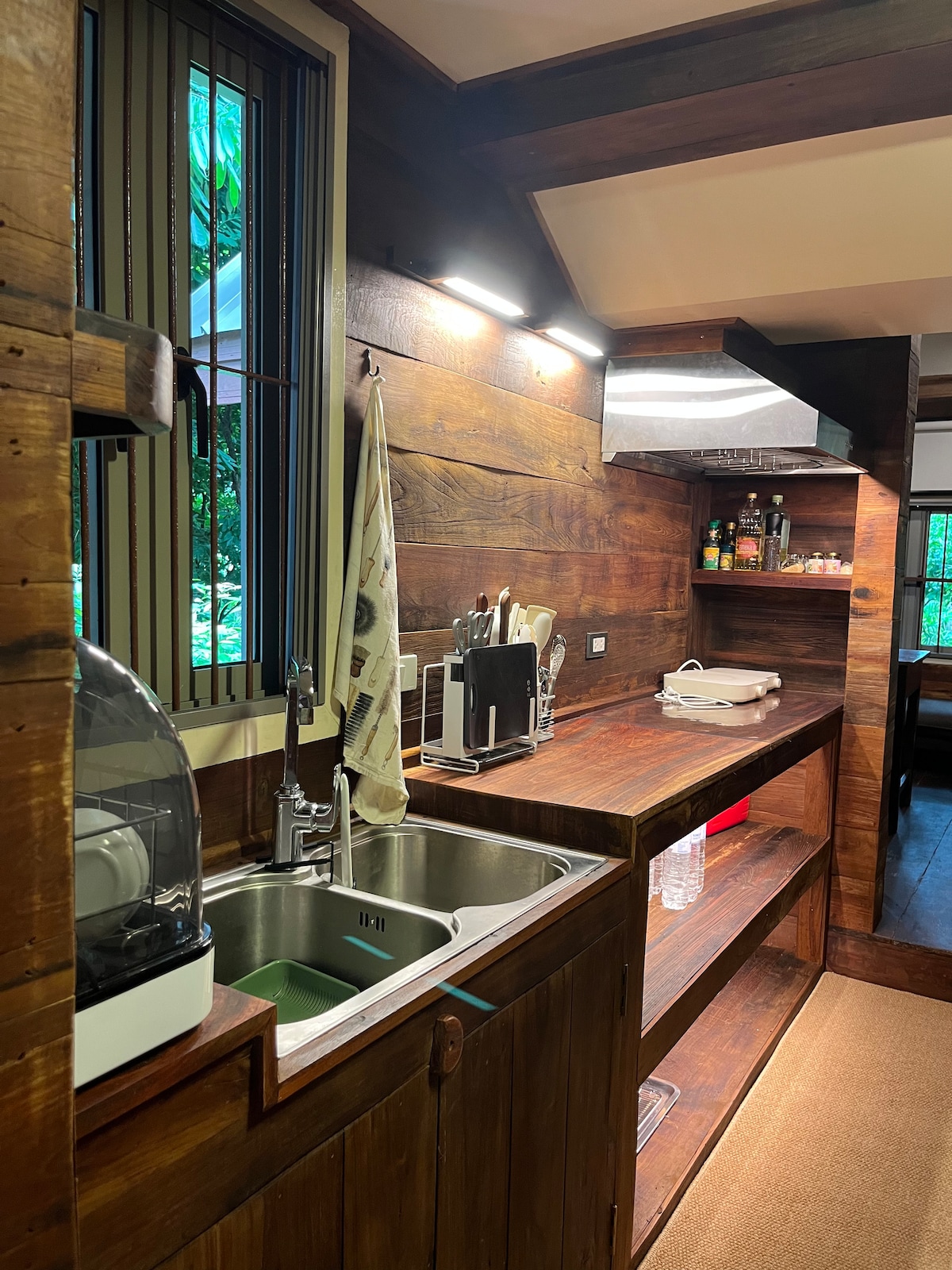 Esta pequeña casa tiene vistas a las montañas y está rodeada de árboles. Este acogedor espacio puede alojar de 1 a 2 personas y cuenta con una cama doble y un baño. Una colina detrás proporciona un espacio para ver salir el sol. El balcón es un lugar ideal para relajarse y disfrutar de la cocina. Se encuentra a 2,5 horas de Bangkok y a 50 minutos de Hua Hin. Conducir un auto o una scooter es una forma cómoda de desplazarte (puedes alquilarlos en HauHin). Hay un espacio para trabajar en línea con aire acondicionado en una casa, una cafetería y una cocina central.