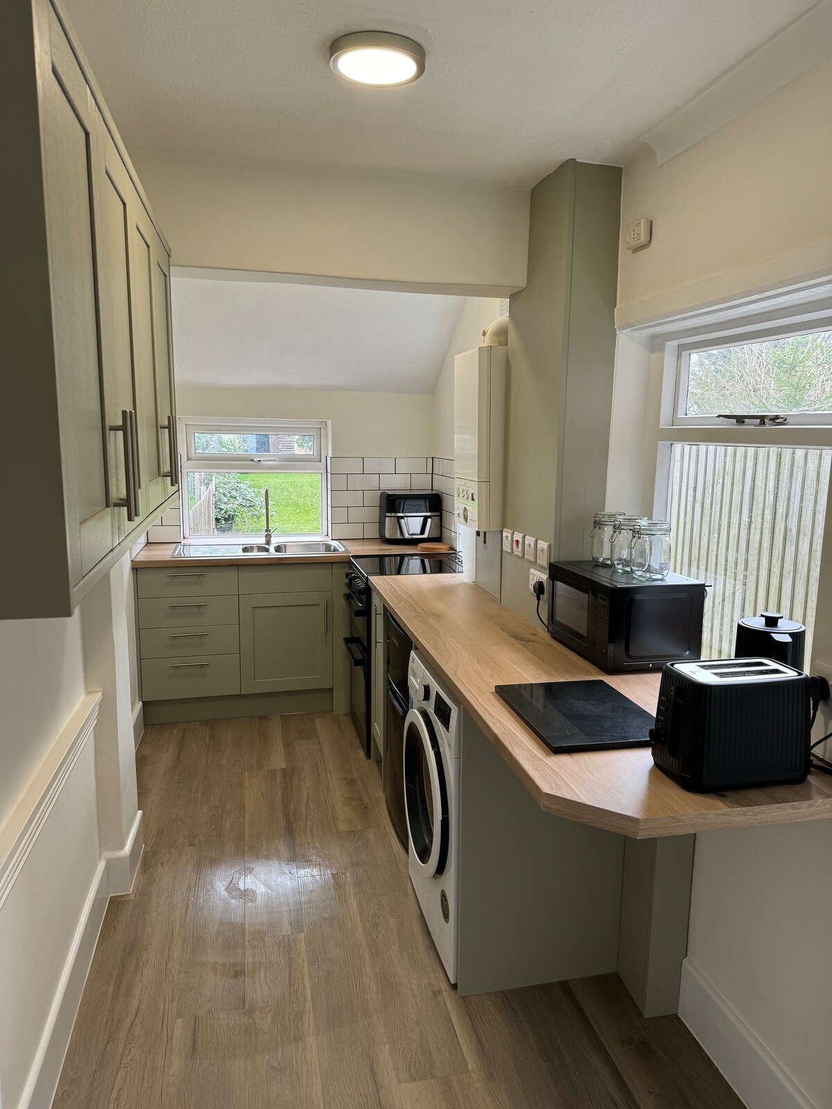 Acogedora casa de entrenamiento cocina abierta con todos los electrodomésticos nuevos. Cocina microondas, nevera, congelador, lavadora, secadora de vino, y todos los utensilios de cocina esenciales. Una zona de estar acogedora y una cama doble con una silla y televisión dobles. La planta superior consta de una cama doble tamaño en la suite. Se proporcionan toallas modernas. Se proporcionan toallas. El dormitorio también tiene una televisión montada en la pared. Esta propiedad es acogedora y compacta puede dormir bastante cómodamente. 2 adultos no aptos para niños 2 mascotas como máximo, pero podría considerar más.