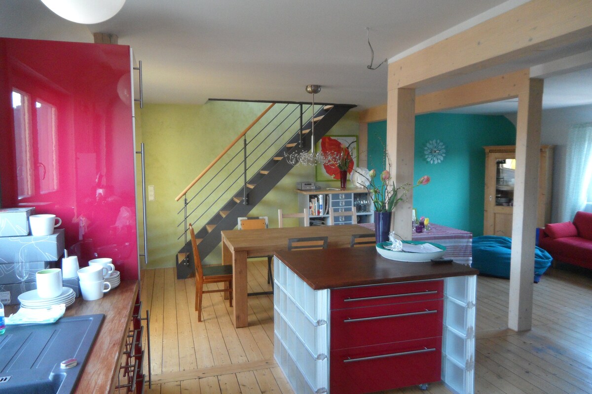 Vivir en una casa Gründerzeit: ¡única, acogedora y un poco más hermosa! El moderno departamento loft está ubicado en una hermosa casa Gründerzeit en el centro de la ciudad de Hof. La zona peatonal y la estación de tren están a solo unos minutos a pie. El loft tiene una pequeña cocina, una cama tamaño queen, un baño privado con bañera independiente, así como una ducha en el piso. Los focos del techo se pueden ajustar en color para crear un ambiente acogedor individualmente para bañarse.