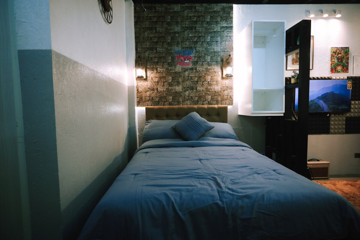 Estudio industrial moderno en la ciudad de Naga, habitación 7 en el tercer piso cerca de la azotea con vistas al monte. Isarog. Interiores amplios y acogedores con HBO Max y Netflix. Un estilo con interiores cálidos, texturas crudas y espacio para relajarse. Sala de música privada disponible. Cerca de centros comerciales, hospitales, restaurantes y las principales atracciones, todo a pocos minutos. Perfecto para relajarte, trabajar o explorar. Disfruta de estilo, comodidad y conveniencia en el corazón de la ciudad en JM Residences.