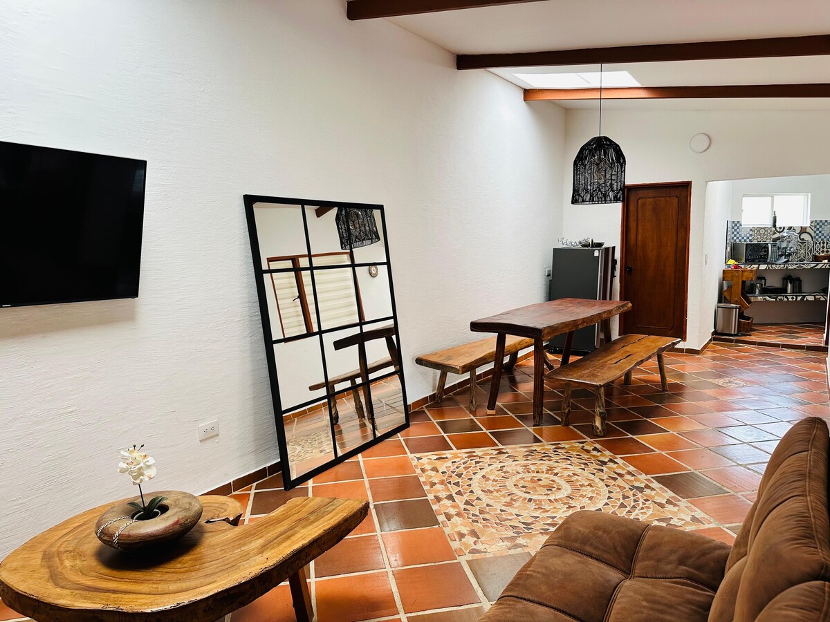 Alma Verde es mucho más que un hospedaje. Es tu casa de campo en un lugar de ensueño; un refugio natural, ubicado en un entorno natural privilegiado, muy cerca del casco urbano de Ráquira. Rodeado de naturaleza exuberante, árboles frutales y flores, que llenan el aire de fragancias y colores; un verdadero oasis de paz. La casa dispone de una habitación grande, cama king y sofá cama, además baño completo, también cuenta con cocina dotada, horno a leña, comedor y sala en un solo ambienté