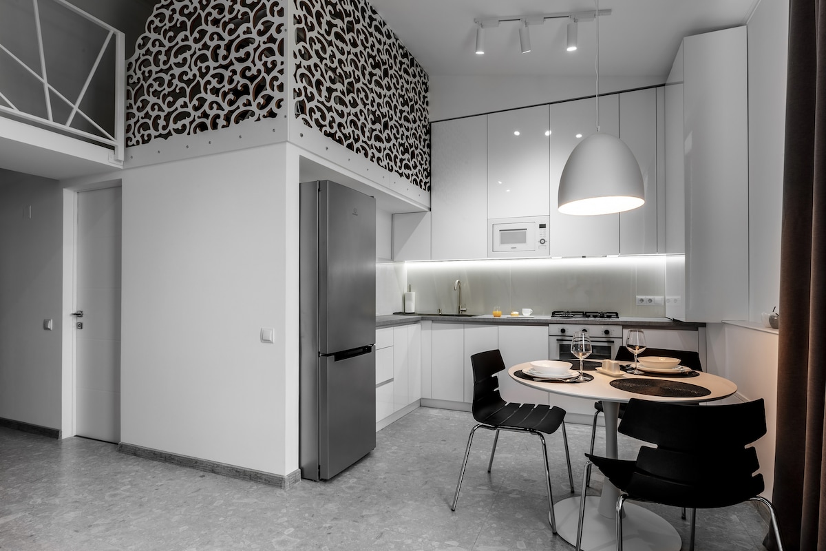 ¡Despiértate sobre la ciudad! Disfruta de las vistas panorámicas del centro de Chișinău desde tu balcón privado en la azotea en este moderno ático de diseño. Techos altos (hasta 5 m), dormitorio separado, oficina en el entrepiso con cama supletoria, amplia sala de estar que se abre a una terraza, cocina totalmente equipada, armario y baño. El balcón rodea el departamento. Wifi, 2 televisores inteligentes, aire acondicionado, espacio de trabajo, lavadora y secadora incluidos. Ideal para parejas, viajes de negocios o una estancia elegante en la ciudad.
