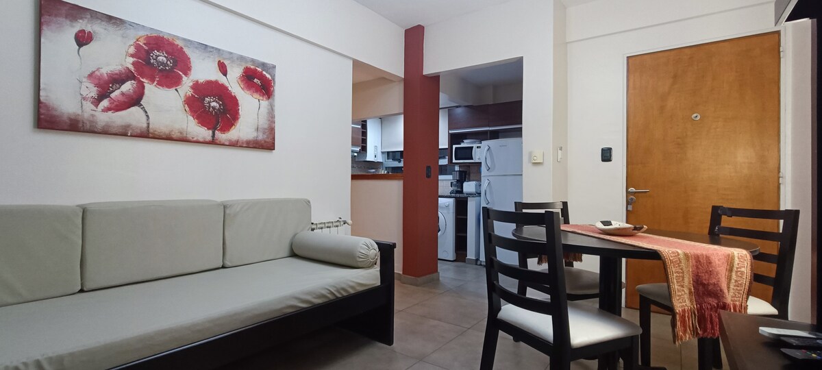 Cuenta con un dormitorio con cama matrimonial, sofá cama en el living, baño completo y balcón con linda vista arbolada. El espacio ofrece: WiFi rápido, TV, aire acondicionado y calefacción Cocina equipada + ropa blanca incluida Estilo moderno con muebles nuevos y detalles coloridos Ubicación privilegiada: A 4 cuadras del centro de calle 12 A pocos minutos de Plaza Moreno y Plaza Rocha Cerca del Hospital de Niños y principales atractivos de la ciudad