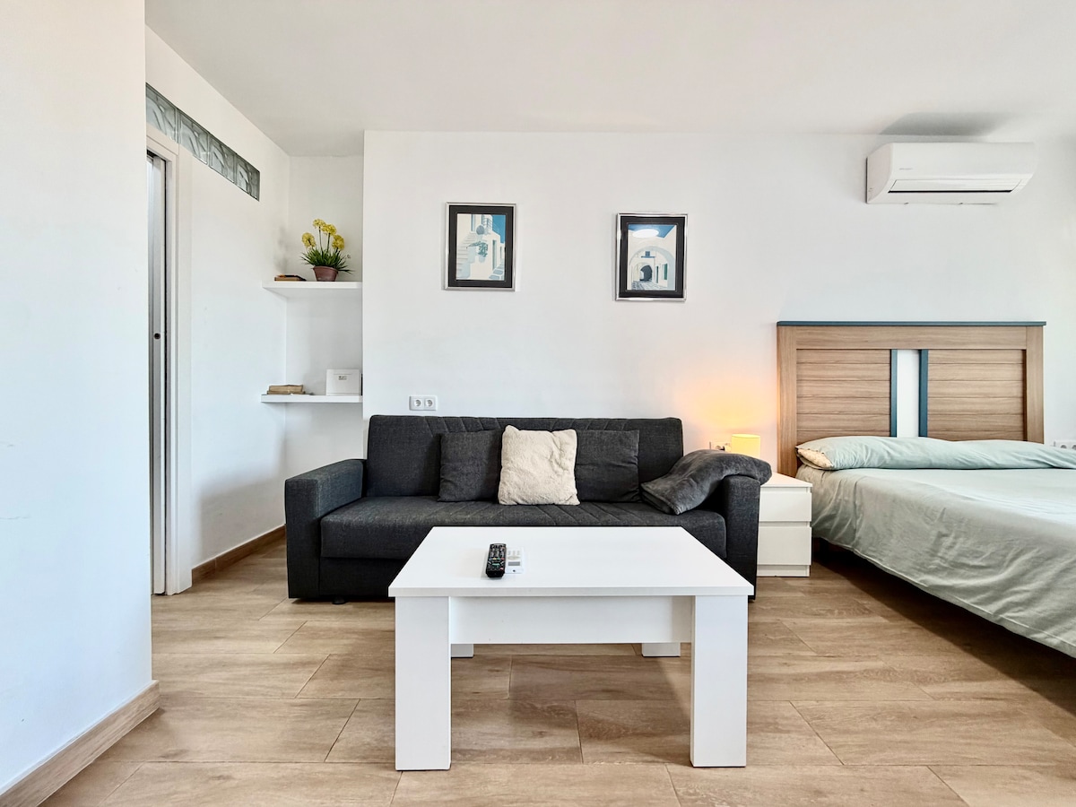 Estudio con terraza y vistas al mar frente a la playa. Cuenta con aire acondicionado, smart tv, netflix y punto de lectura. El complejo Benalbeach alberga gimnasio de pago, mini parque acuático con toboganes en las piscinas, supermercado, sala de juegos y snack bar disponible durante el verano. Durante el invierno se modifican las aperturas de las piscinas, pero jardines disponibles todo el año. - Prohibido fumar. - Mascotas no permitidas.