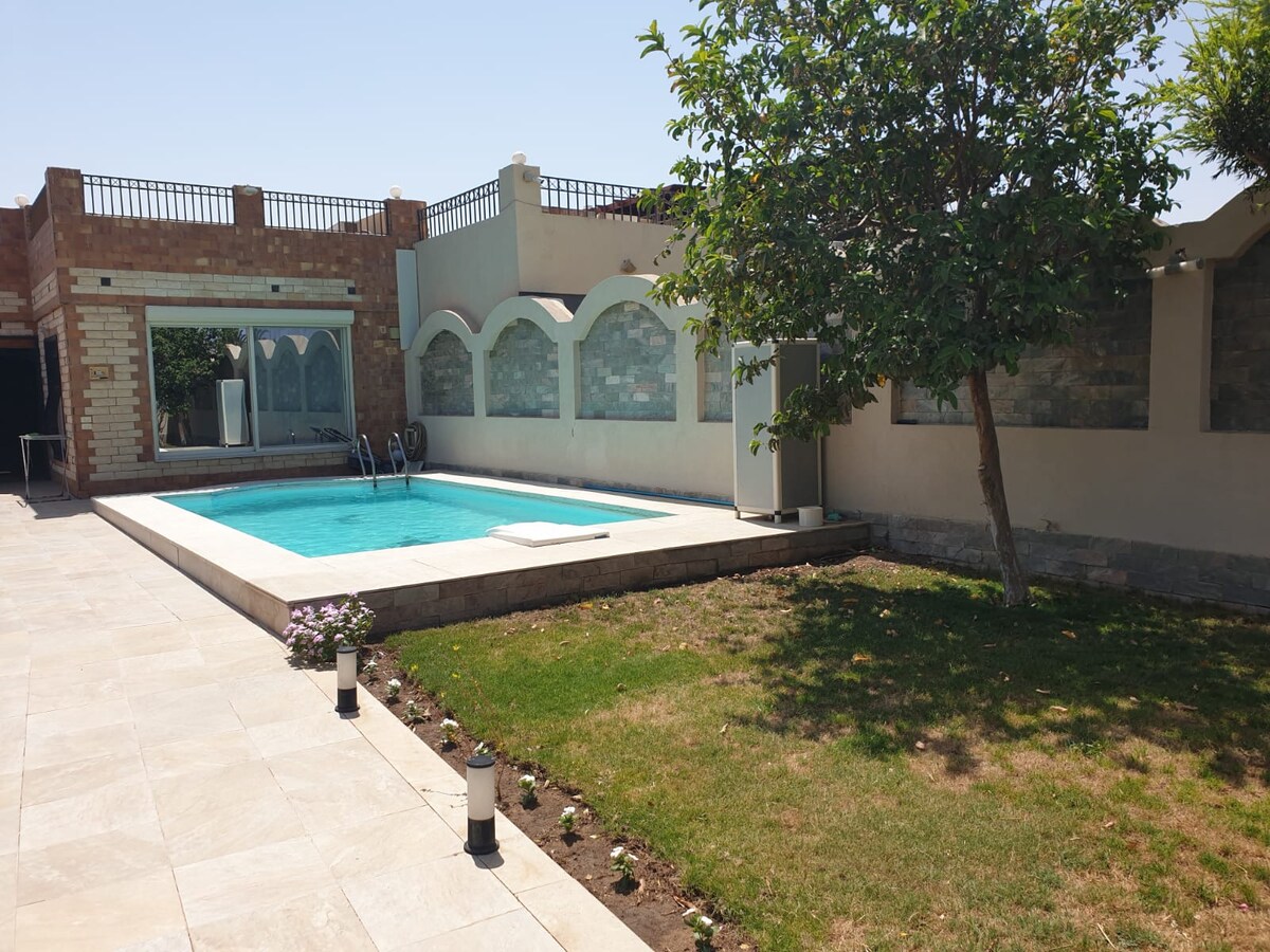 Increíble y único en Hurghada, casa de vacaciones para familias o una escapada romántica para recién casados con una gran piscina privada solo para ti, nada se comparte. Amplio salón, con cocina abierta y rincón de juguetes. Arriba, dormitorio principal con ducha y un dormitorio con cama tamaño king, litera y una Playstation 5. Baño para relajarse completamente con un gran jacuzzi. La villa está totalmente equipada con todo lo que necesitas. Será un honor darte la bienvenida y hacer que tu estancia sea increíble y organizar viajes para ti.