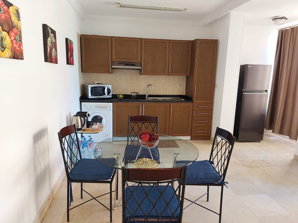 ¡Bienvenido a tu elegante estudio en Hurghada, a solo unos pasos del Mar Rojo! El luminoso estudio ofrece una comodidad moderna con una sala de estar abierta, una acogedora sala de estar y una zona de cocina totalmente equipada. Disfruta del balcón privado y el área de la piscina rodeada de palmeras y flores. Con servicios como wifi gratuito, aire acondicionado y acceso a piscinas, este estudio ofrece el refugio ideal para tu estancia junto al mar.