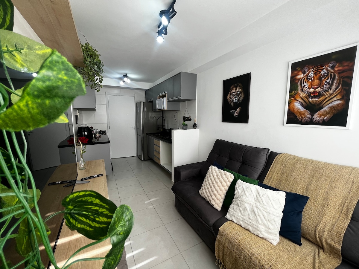 Relájate en un apartamento tranquilo y acogedor, a solo unos pasos de Transamérica Expo, Vibra y Teatro Arena BTG. Disfruta del balcón, el aire acondicionado y la ropa de cama y toallas de primera calidad. Comienza el día con un espresso y cocina con facilidad en la cocina equipada. Fácil acceso en transporte público o en coche, con estacionamiento de pago. Distancias: Transamérica Expo a 7 minutos a pie Vibrar 3 minutos Tokyo Marine Hall a 5 minutos en Uber Consulado a 10 minutos Compras Morumbi 12 min. Aut. Interlagos 20 minutos.