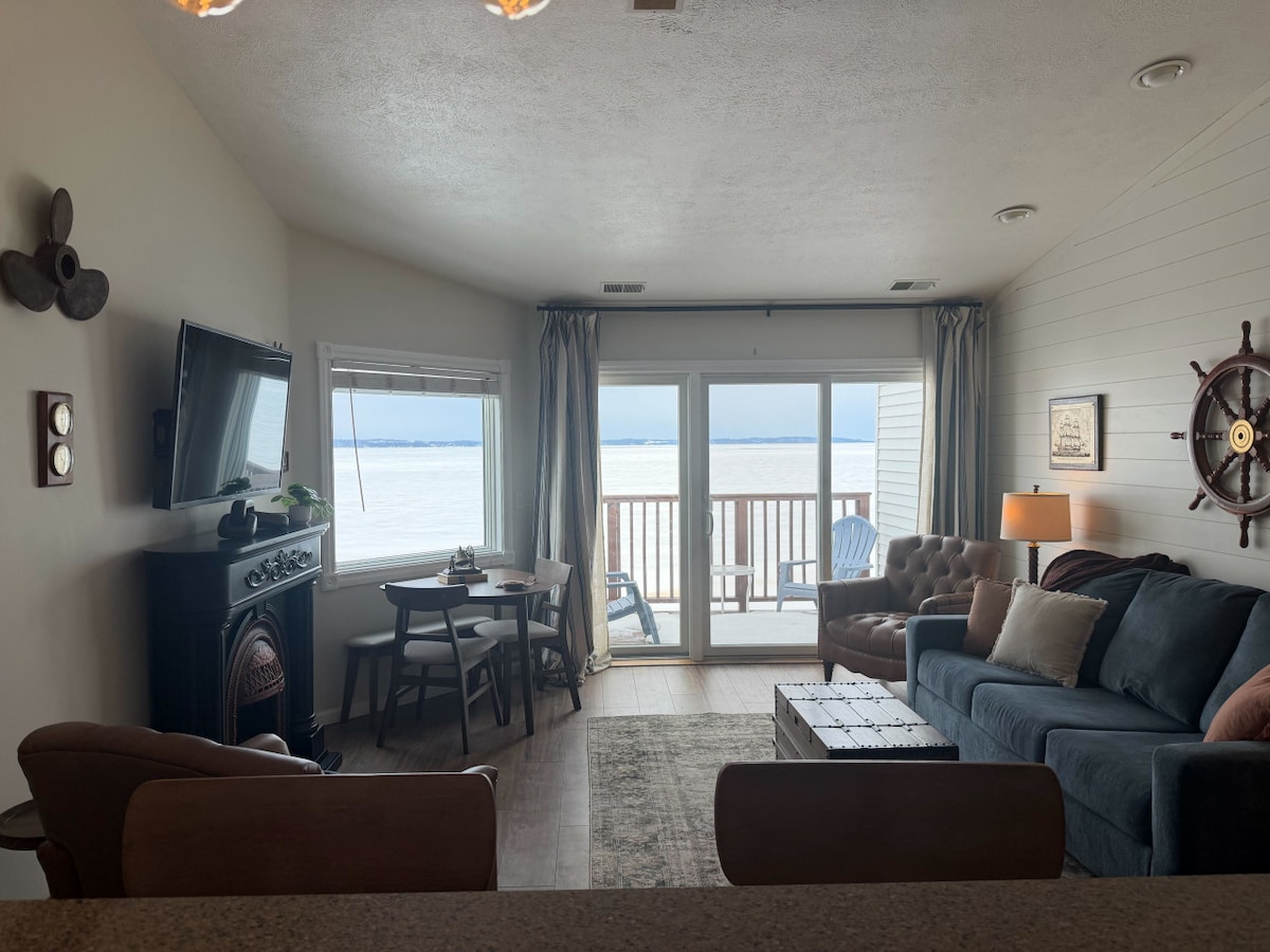 🌊 Beachfront Bliss: ¡Pisa la arena desde tu sala de estar! 🚶♀️ A solo 2 minutos a pie del pintoresco sendero TART para andar en bicicleta y pasear. A 🚗 solo 9 minutos en auto de las bodegas, cervecerías y restaurantes del centro de Traverse City. 🔥 Sauna interior privada: ¡relájate en nuestra sauna en la unidad después de un día de exploración! 🛋️ Acogedor y elegante: relájate en muebles renovados mientras te sumerges en las vistas de la bahía. 📶 Mantente conectado: Wi-Fi gratuito con impresionantes paisajes frente al mar.